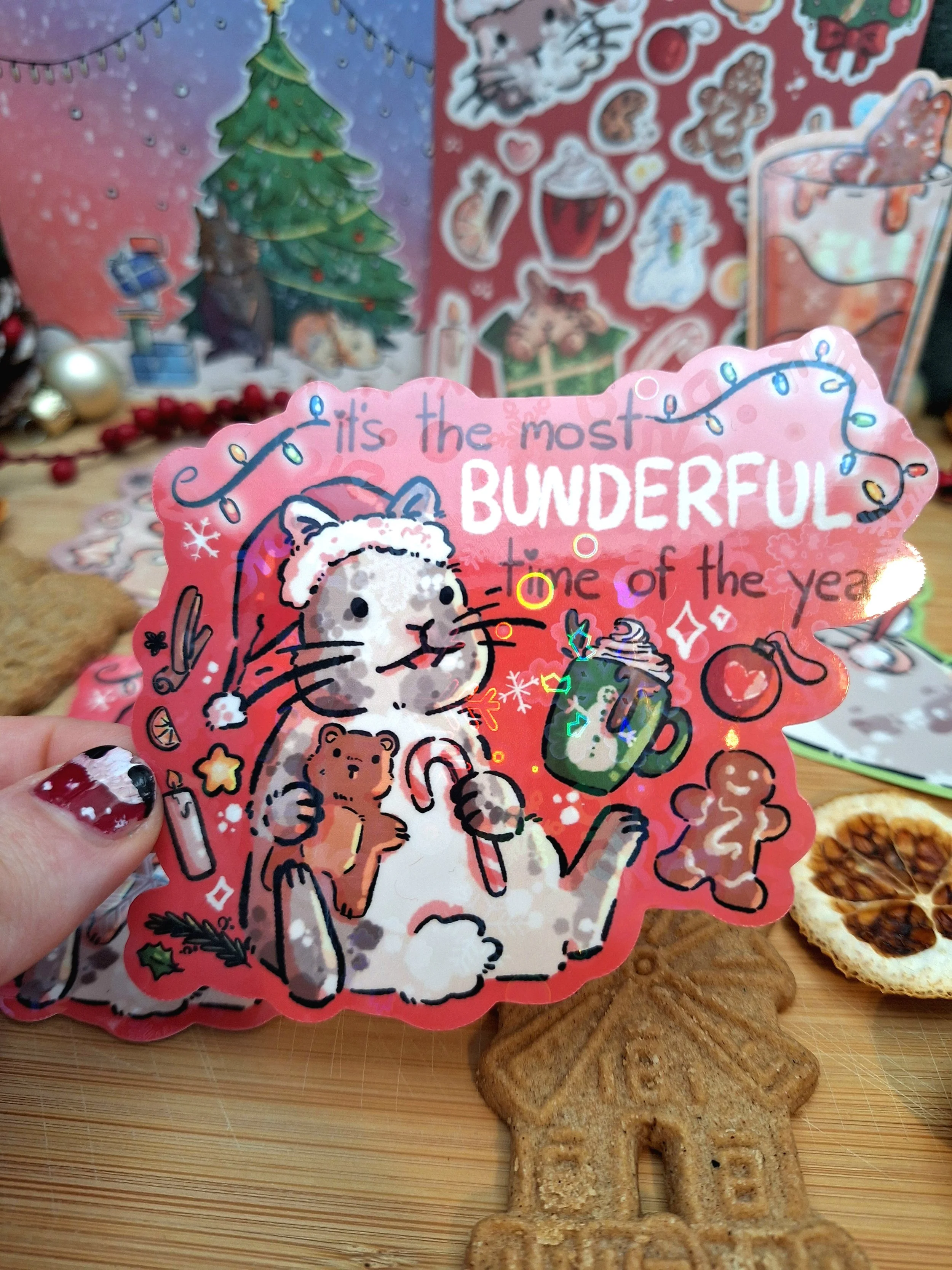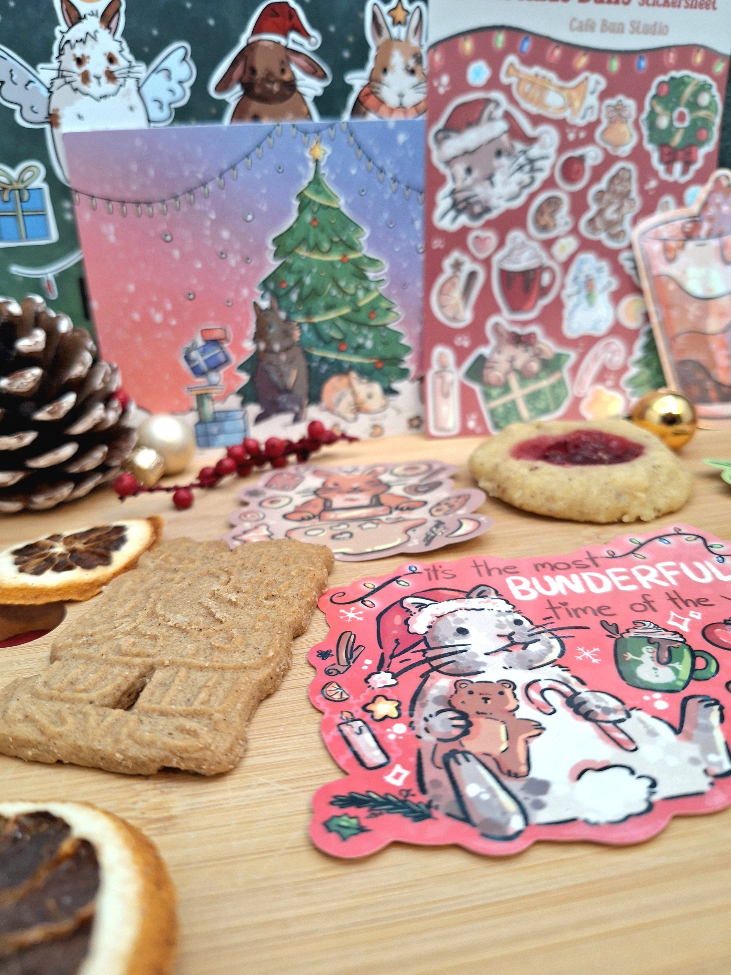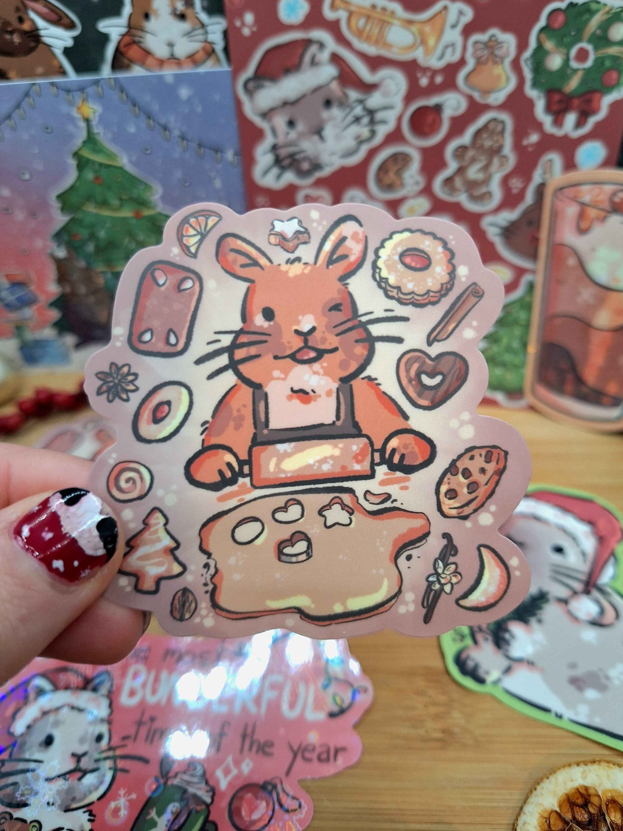 This big sticker features a bunny who loves christmas! Around the bunny are different holiday themed things like colourful christmas lights, spices, a gingerbread man and more. The snowflake holographic laminate adds to the cozy and very christmas-y vibe of the sticker.