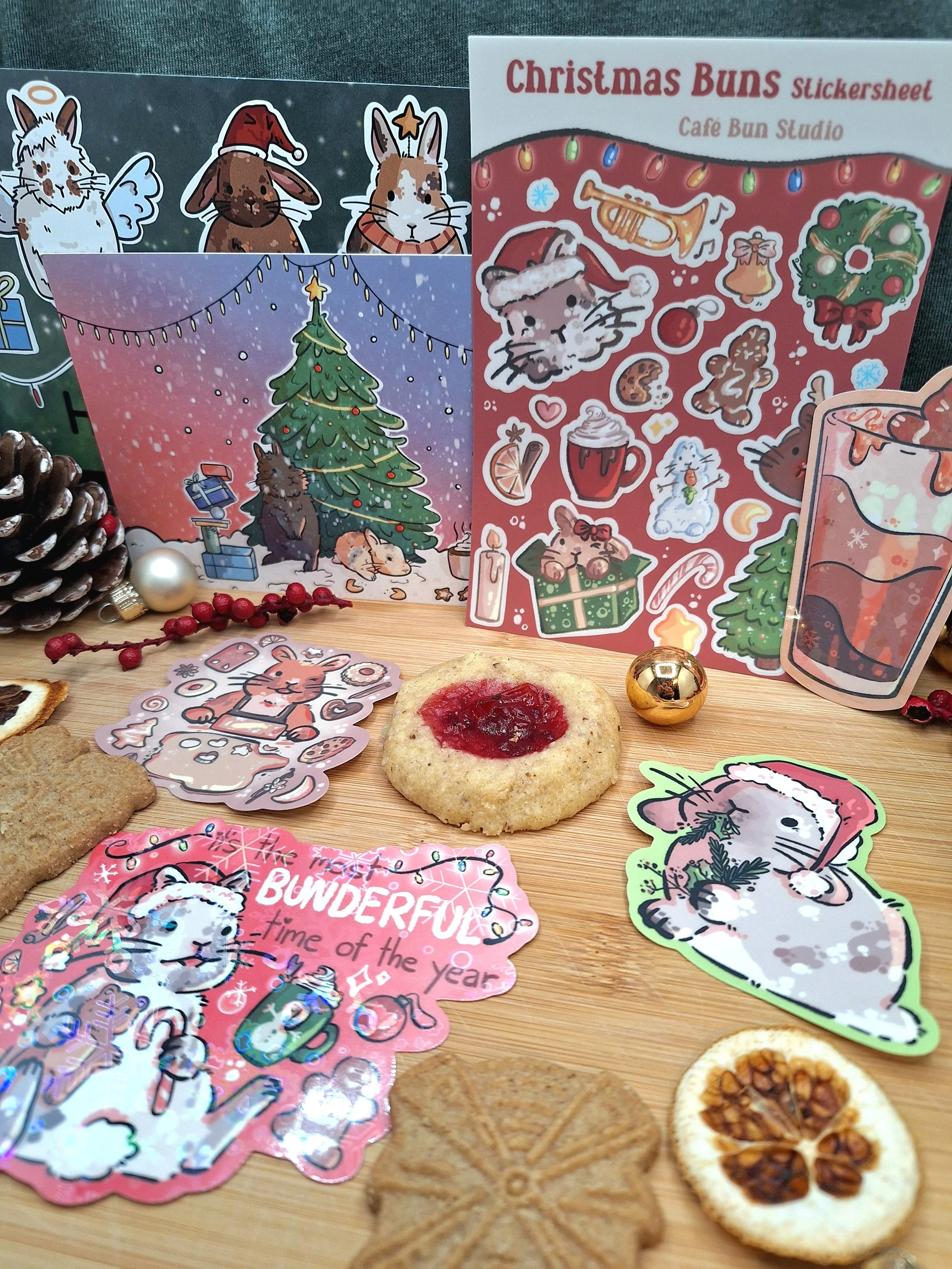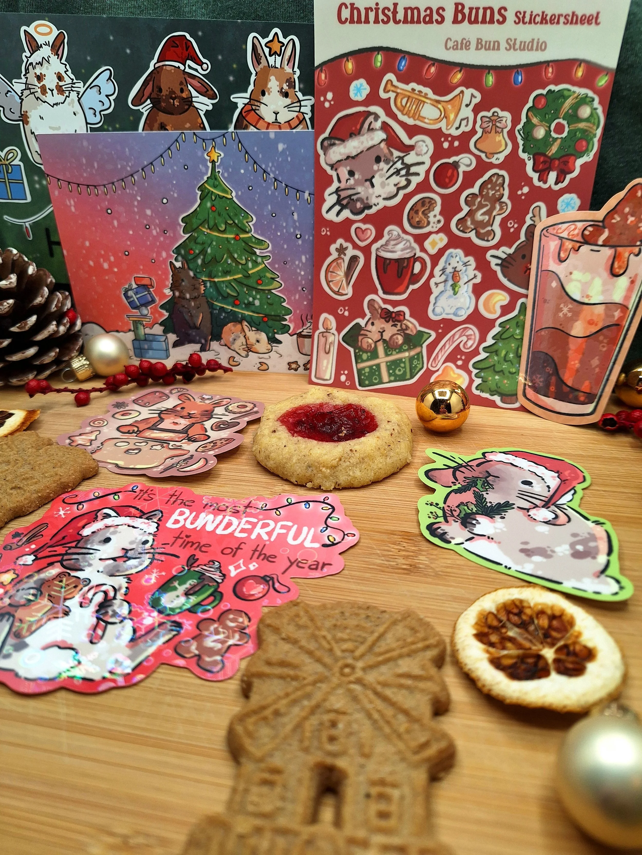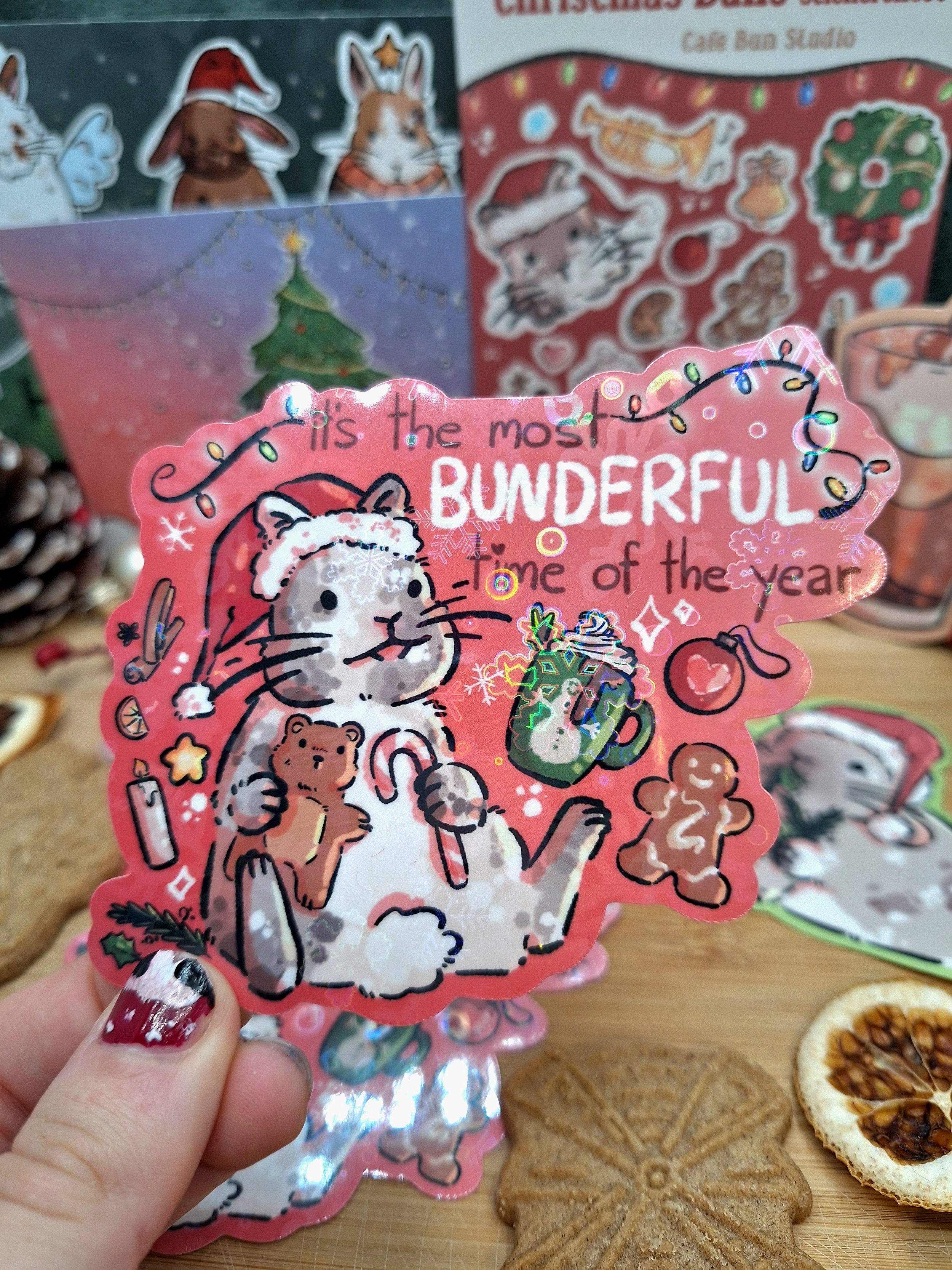 This big sticker features a bunny who loves christmas! Around the bunny are different holiday themed things like colourful christmas lights, spices, a gingerbread man and more. The snowflake holographic laminate adds to the cozy and very christmas-y vibe of the sticker.
