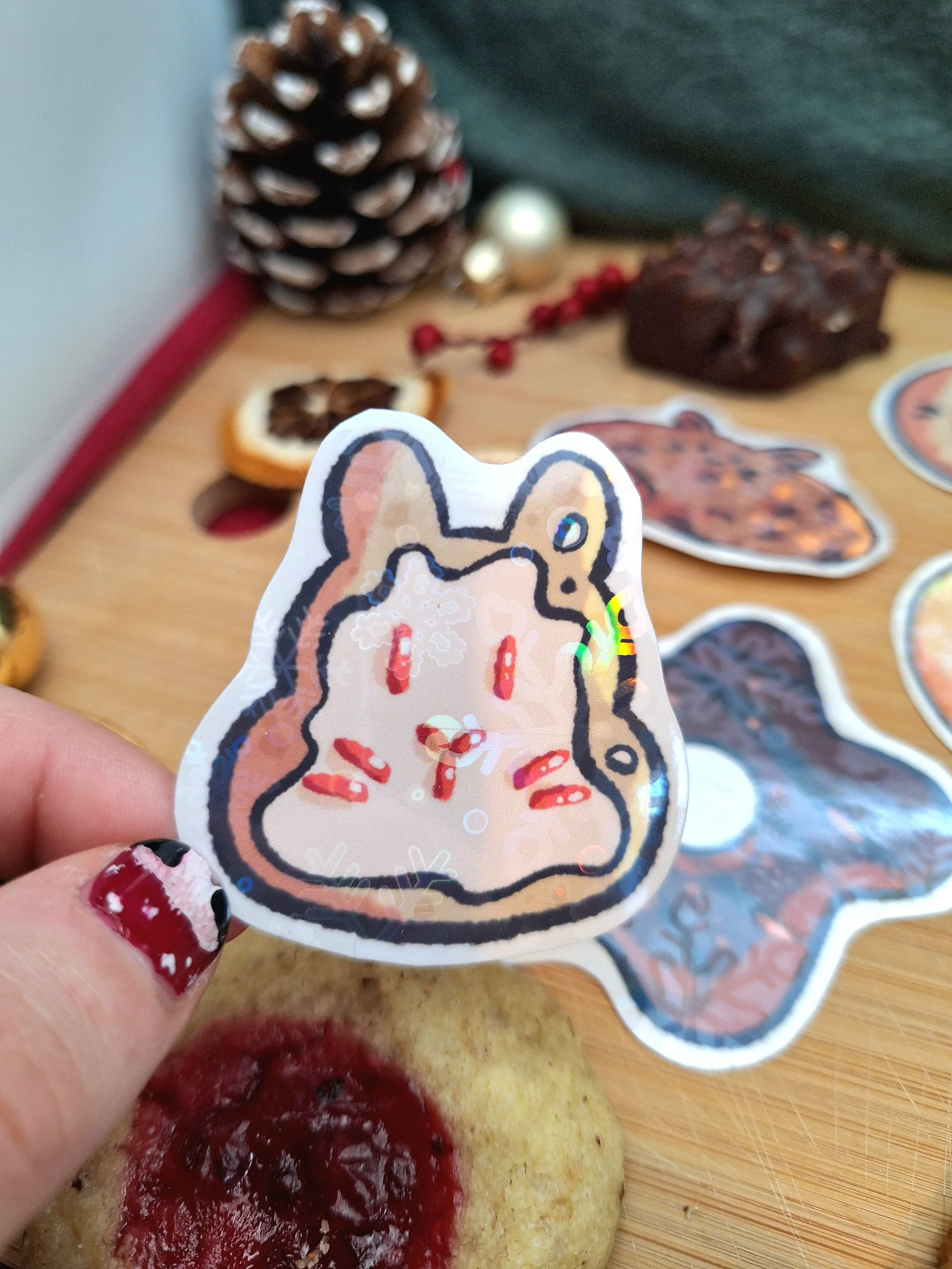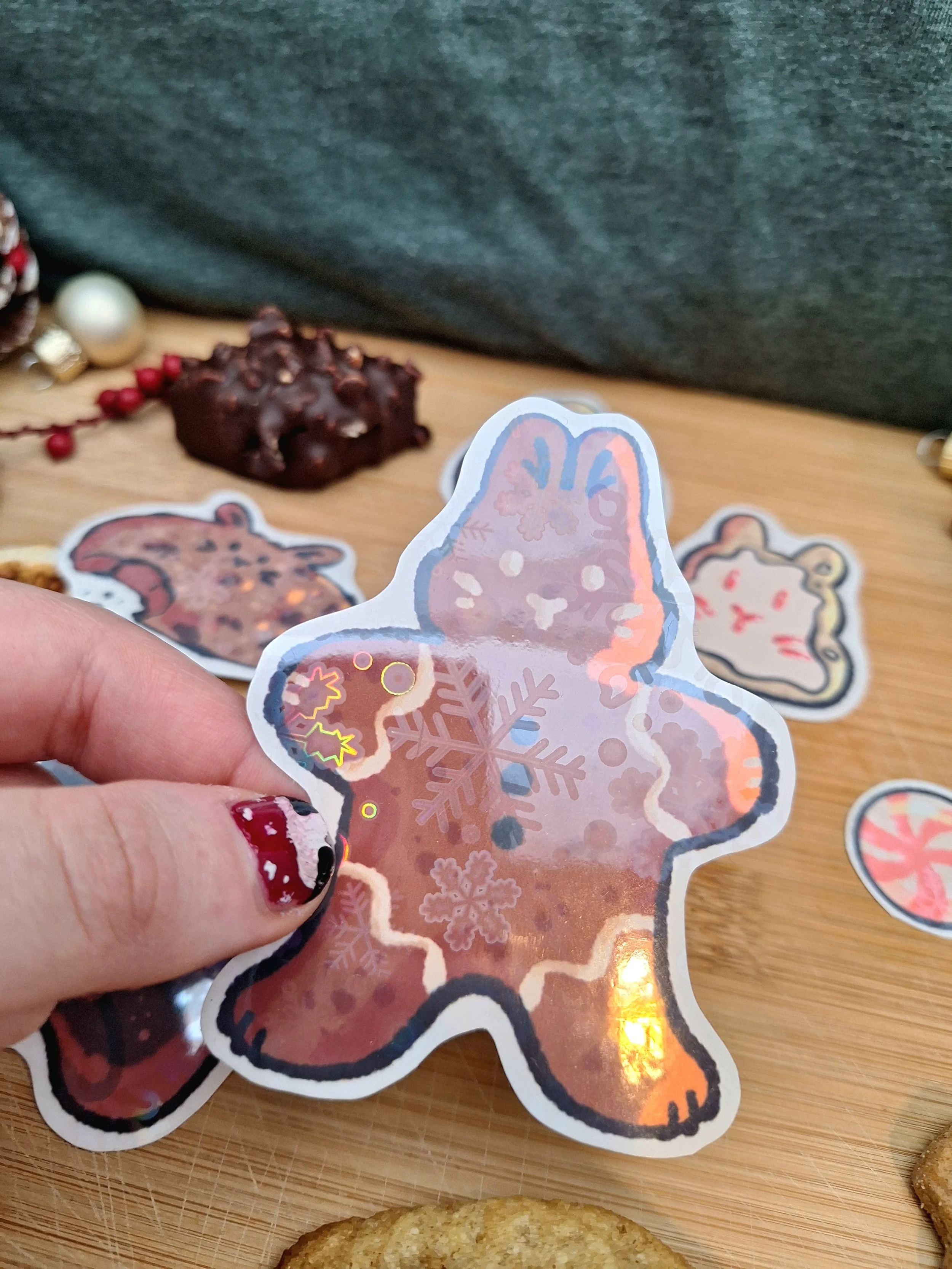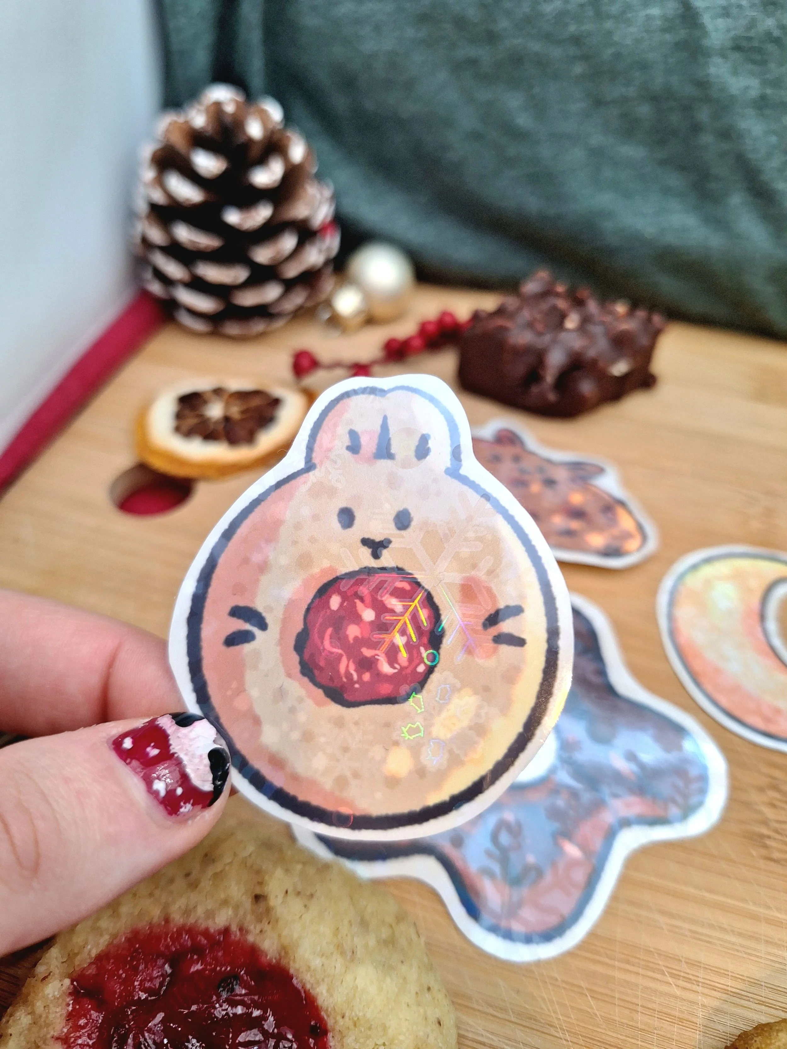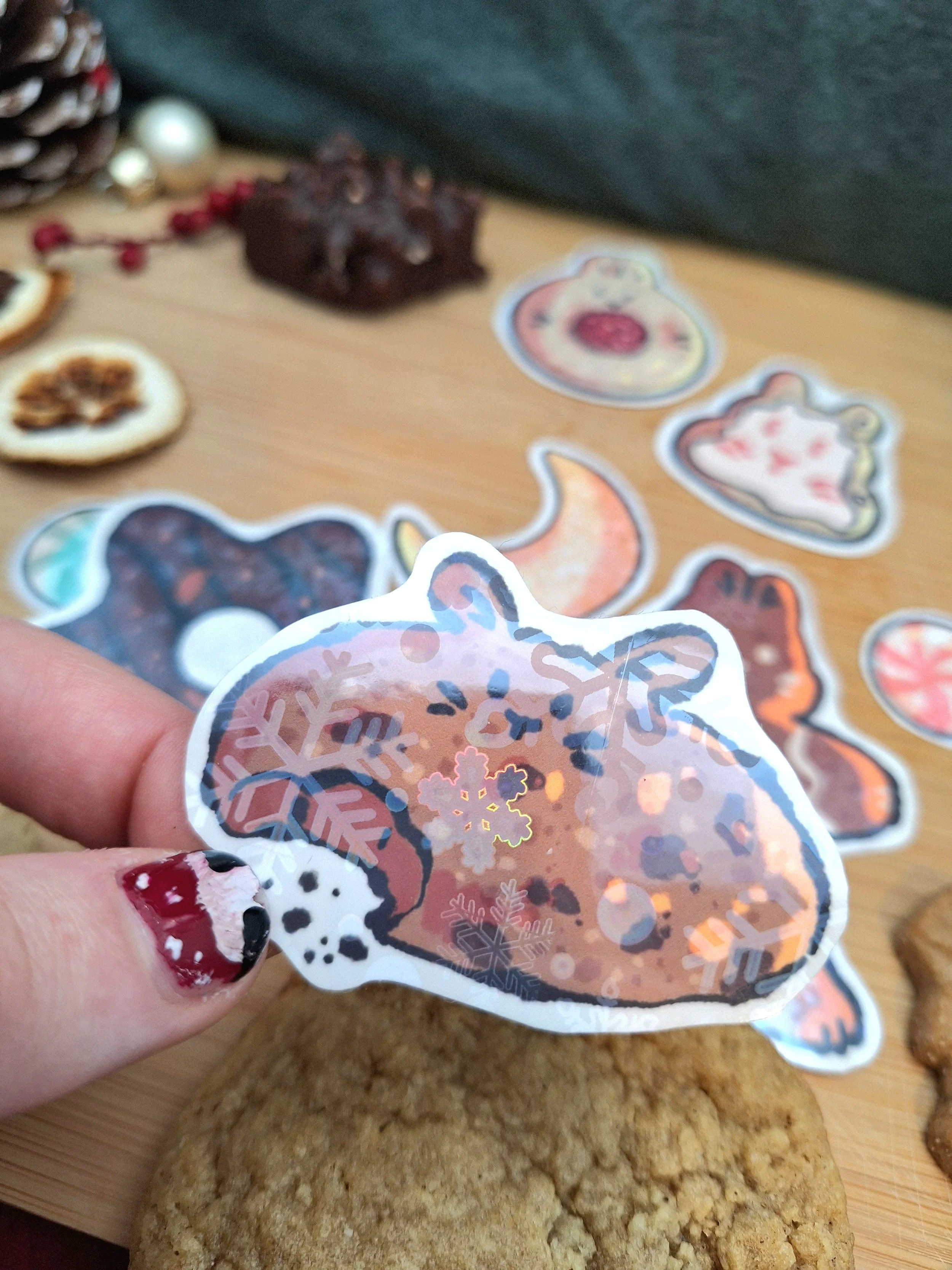 This adorable bunny christmas cookie set consists of 8 stickers in total: 6 bigger ones and two small ones. All stickers are laminated with a festive loking snowflake holographic laminate.