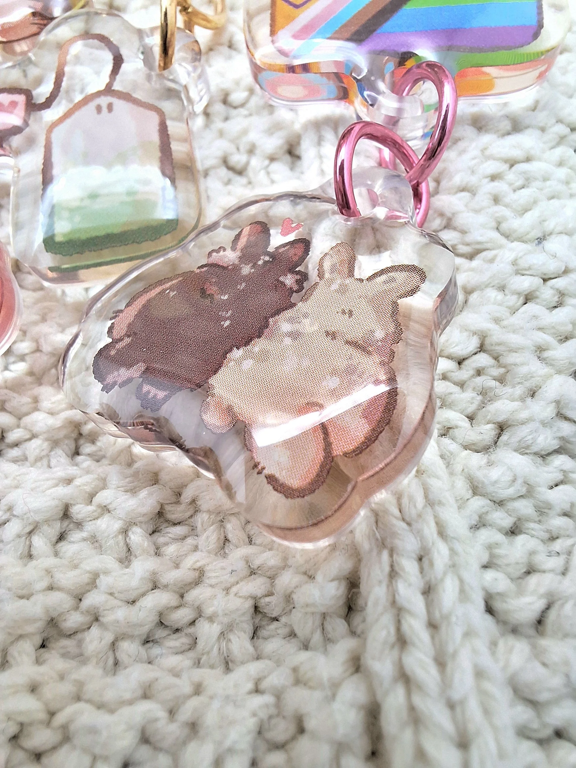 This wooden pin features two bunnies cuddling with a rainbow in the background. The wooden look and feel of this pin add to the cozy cute vibe!