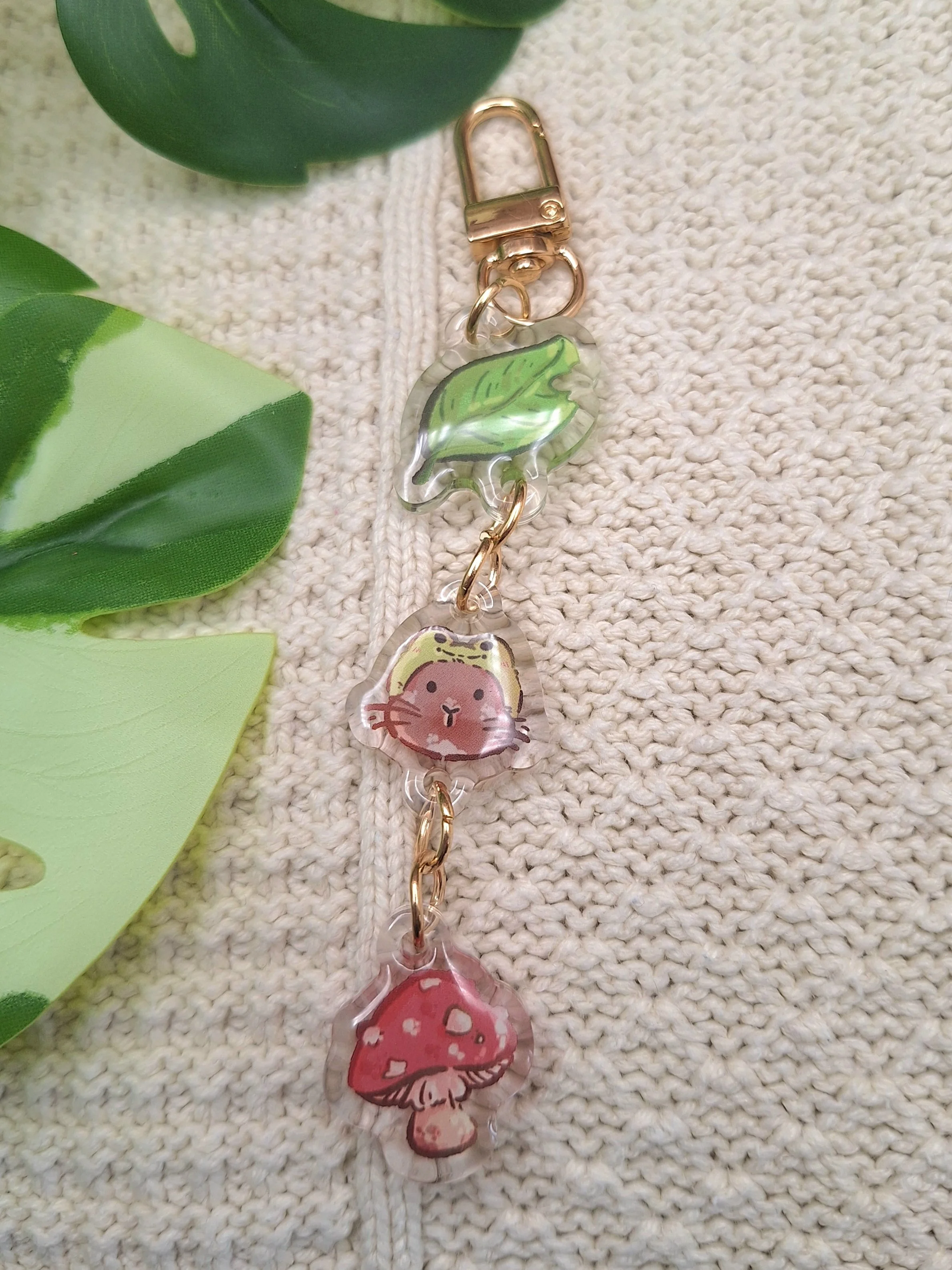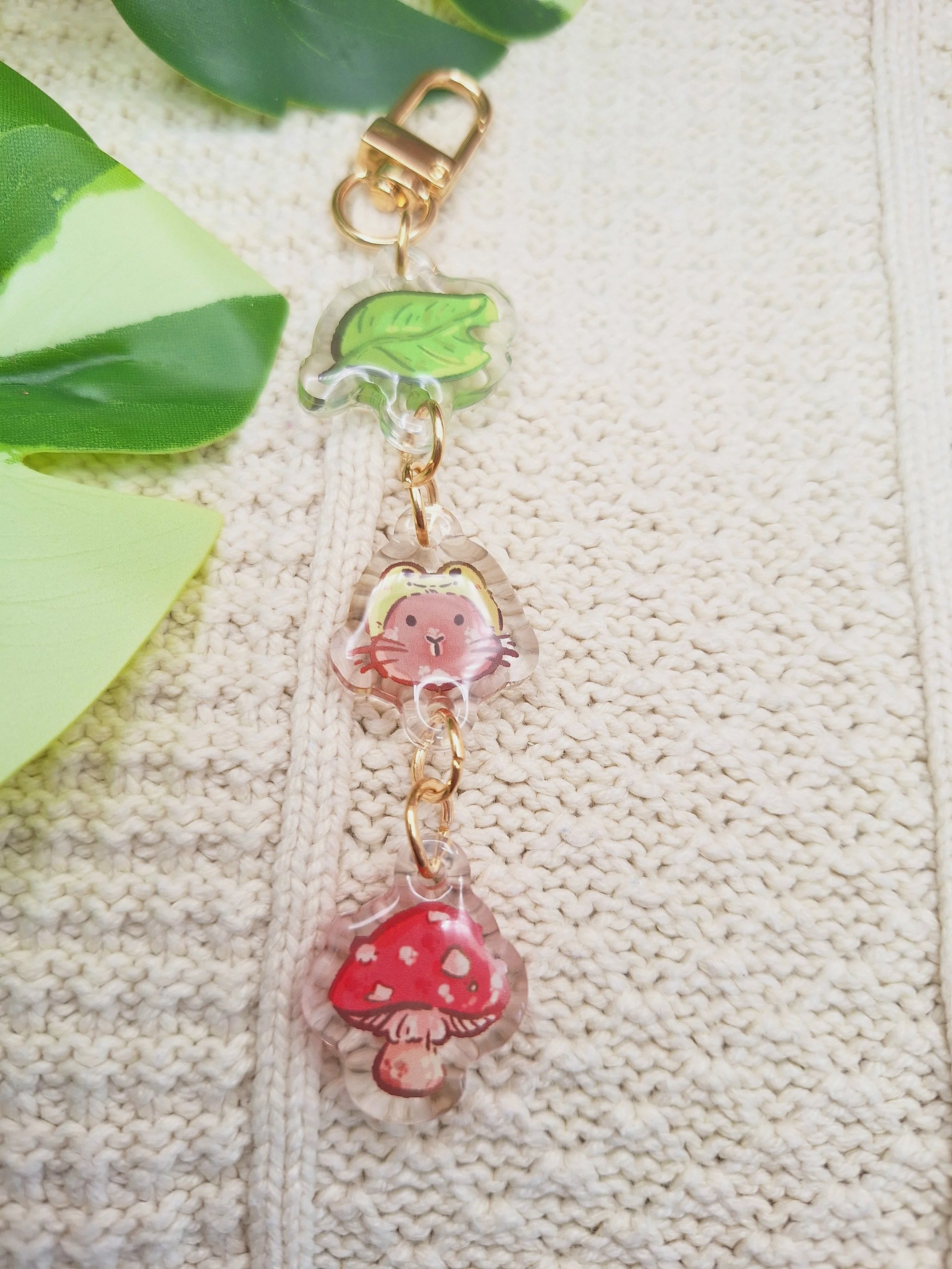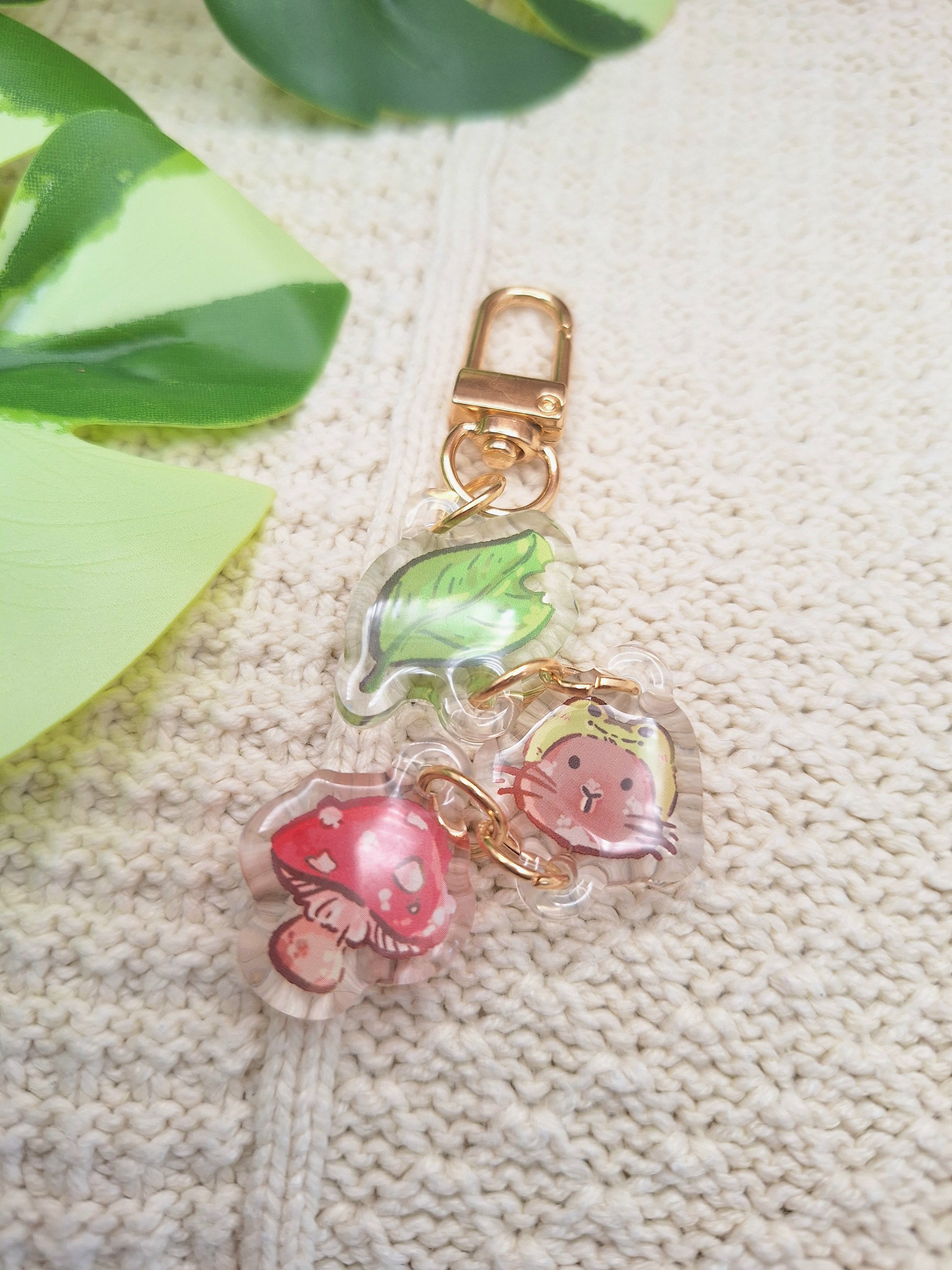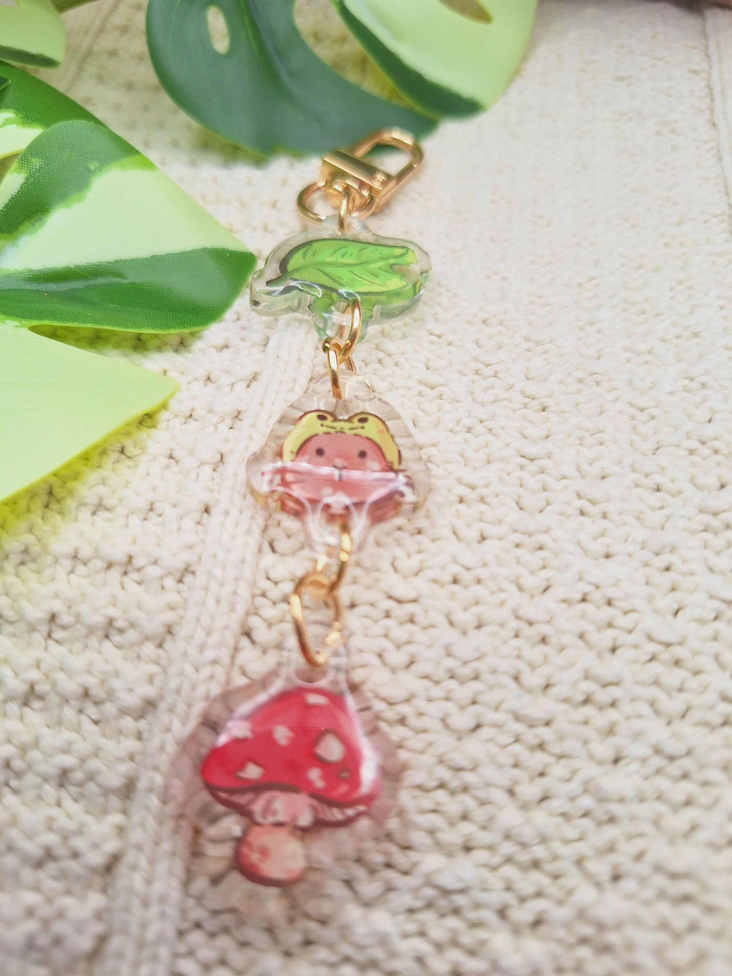This adorable keychain consists of three connected small acrylic charms from top to bottom: a cute little leaf, an adorable bunny disguised as a frog and a mushroom.