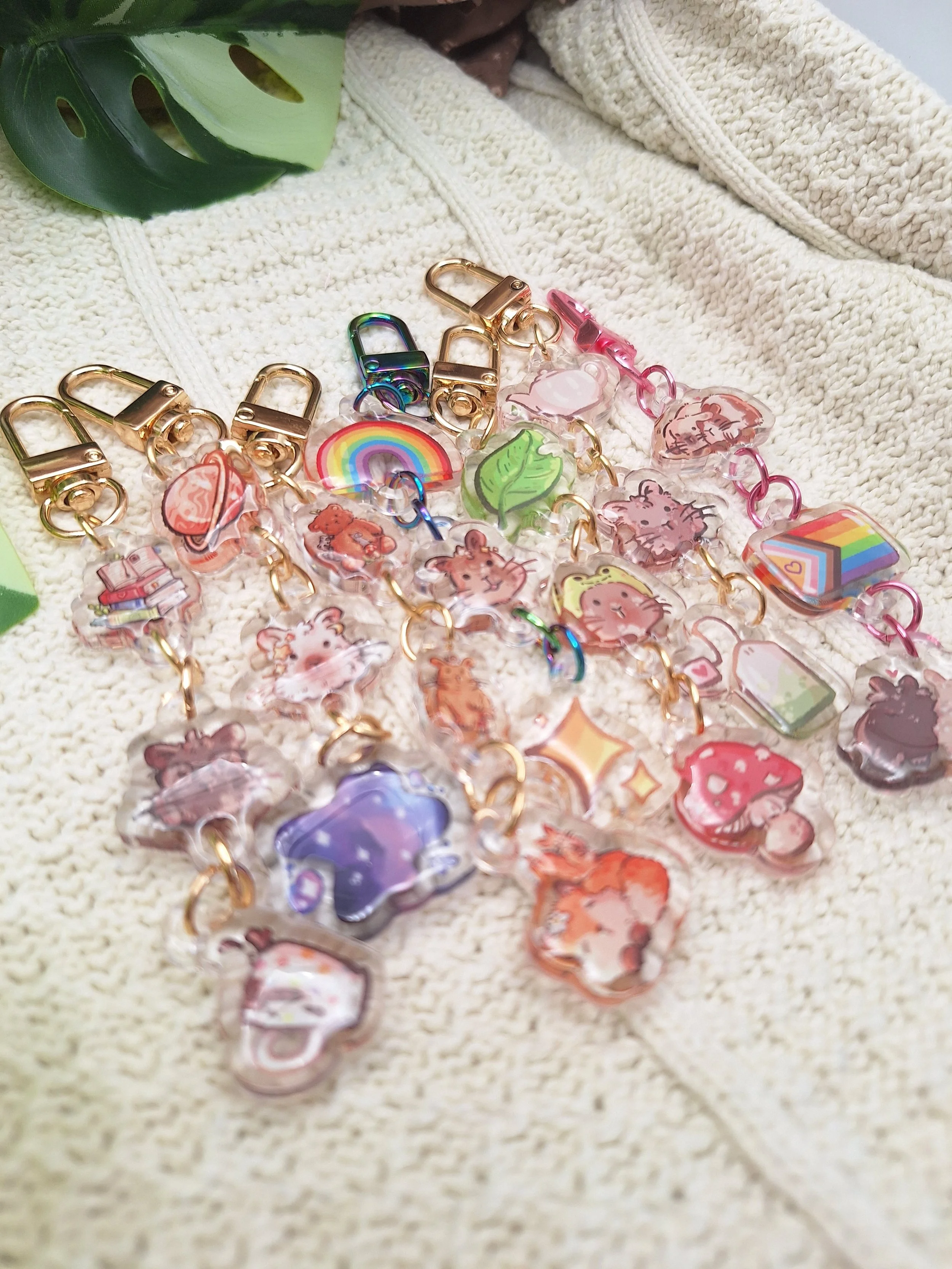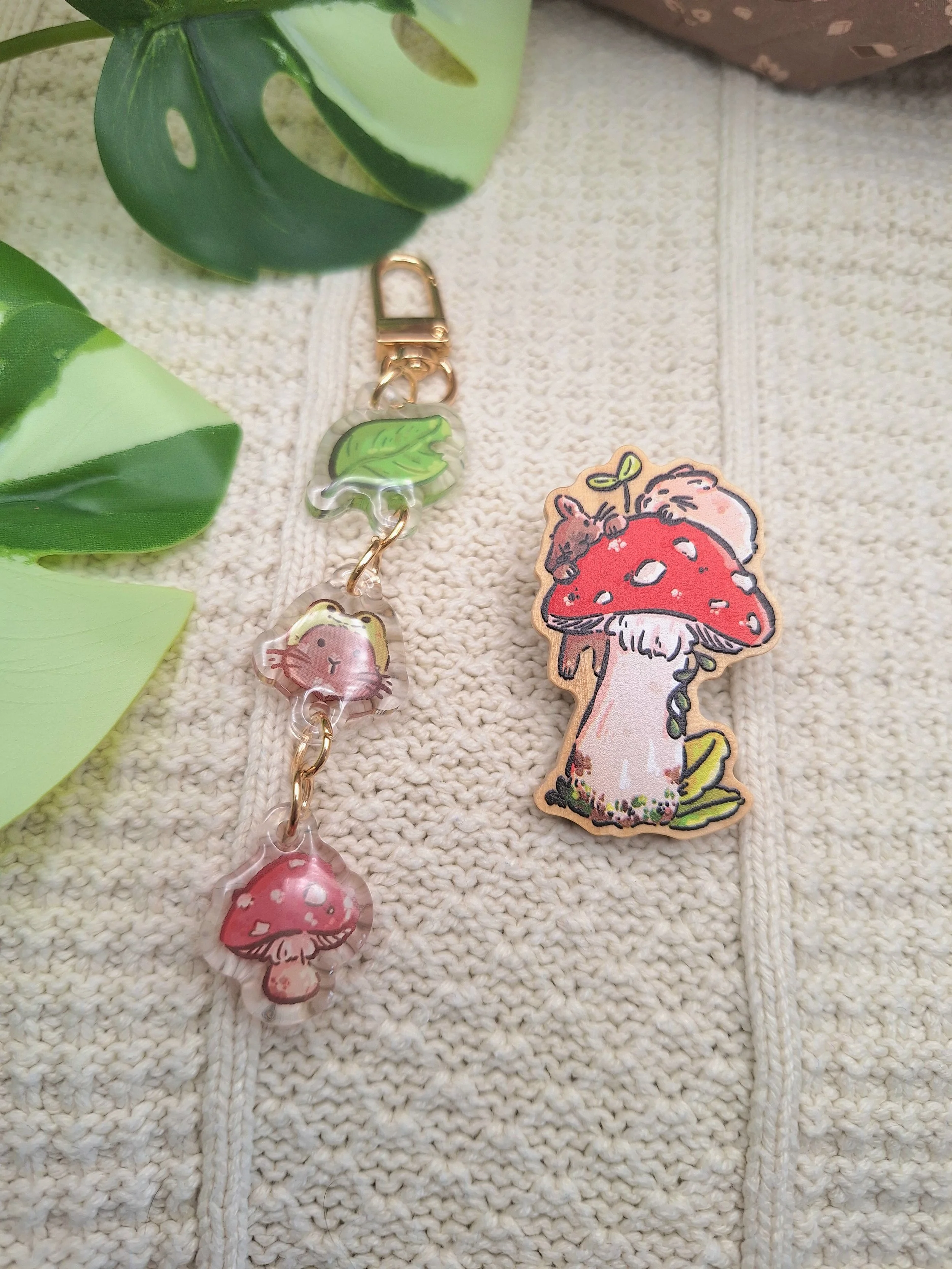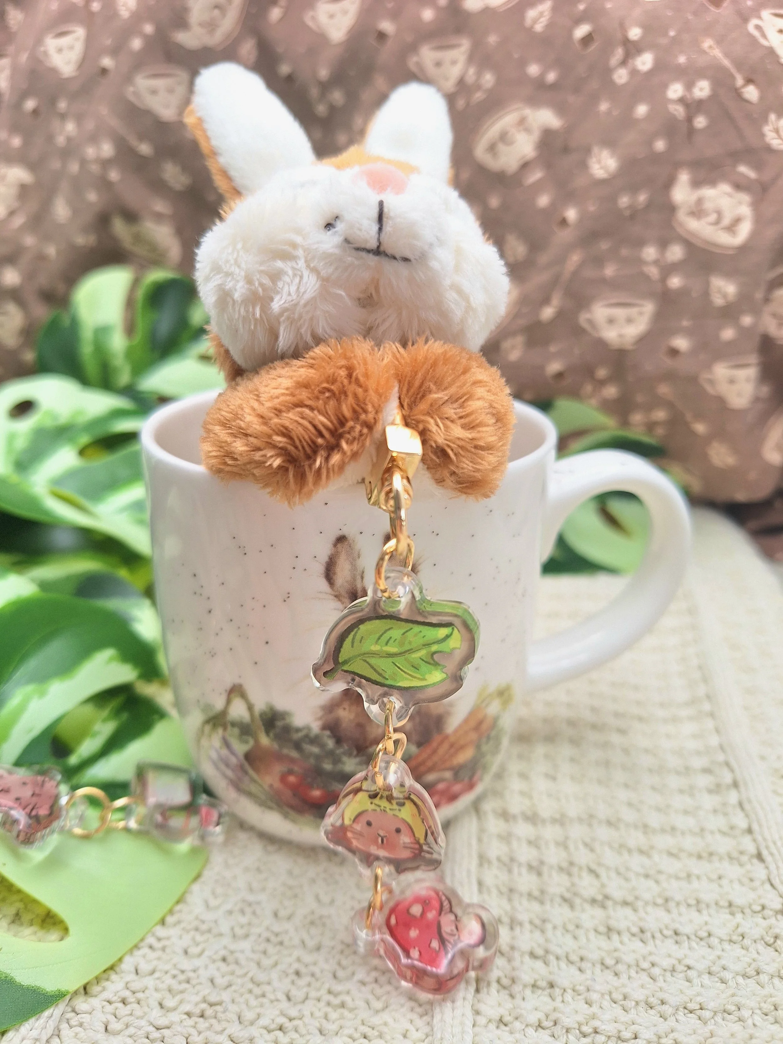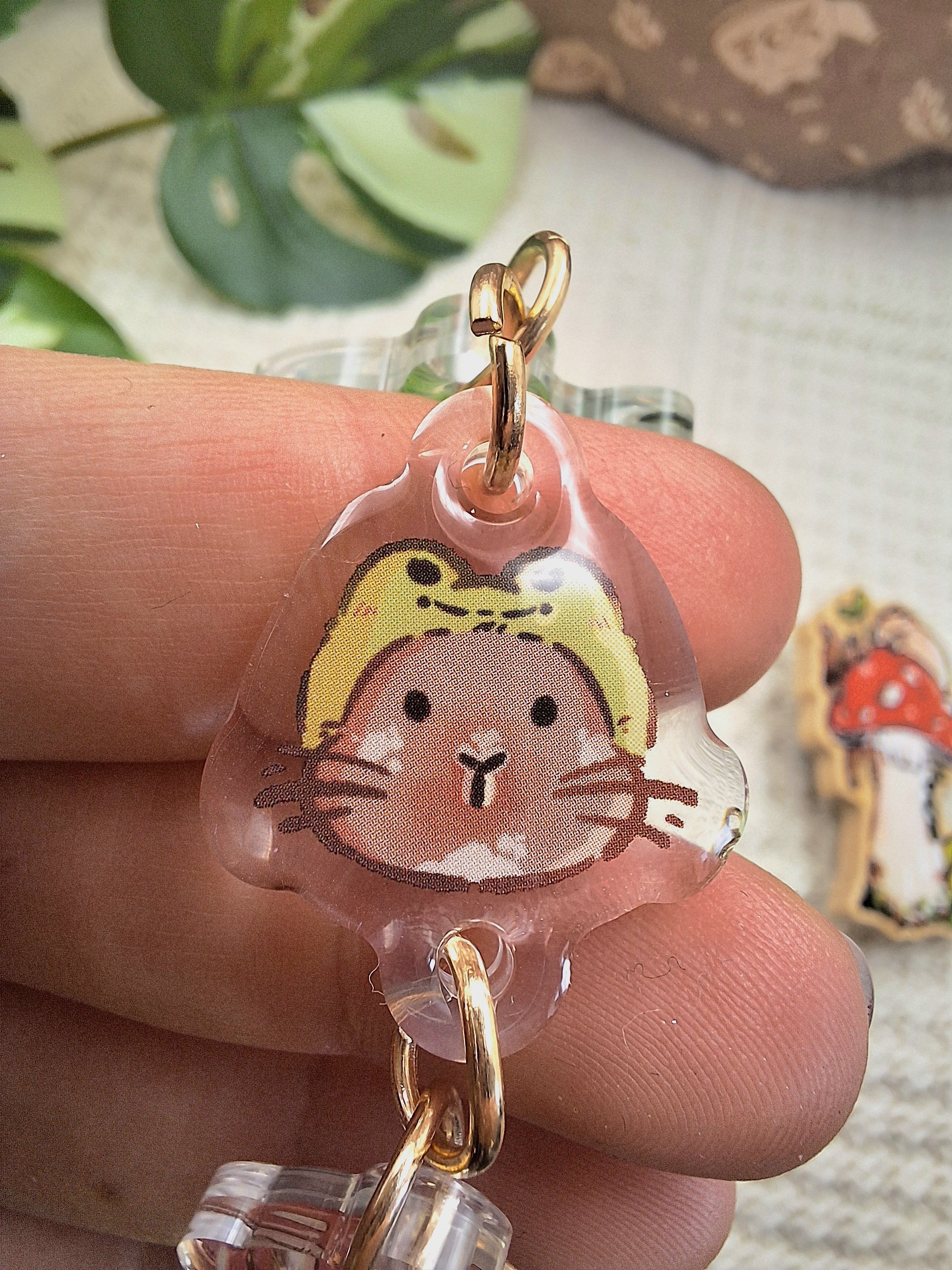 This adorable keychain consists of three connected small acrylic charms from top to bottom: a cute little leaf, an adorable bunny disguised as a frog and a mushroom.