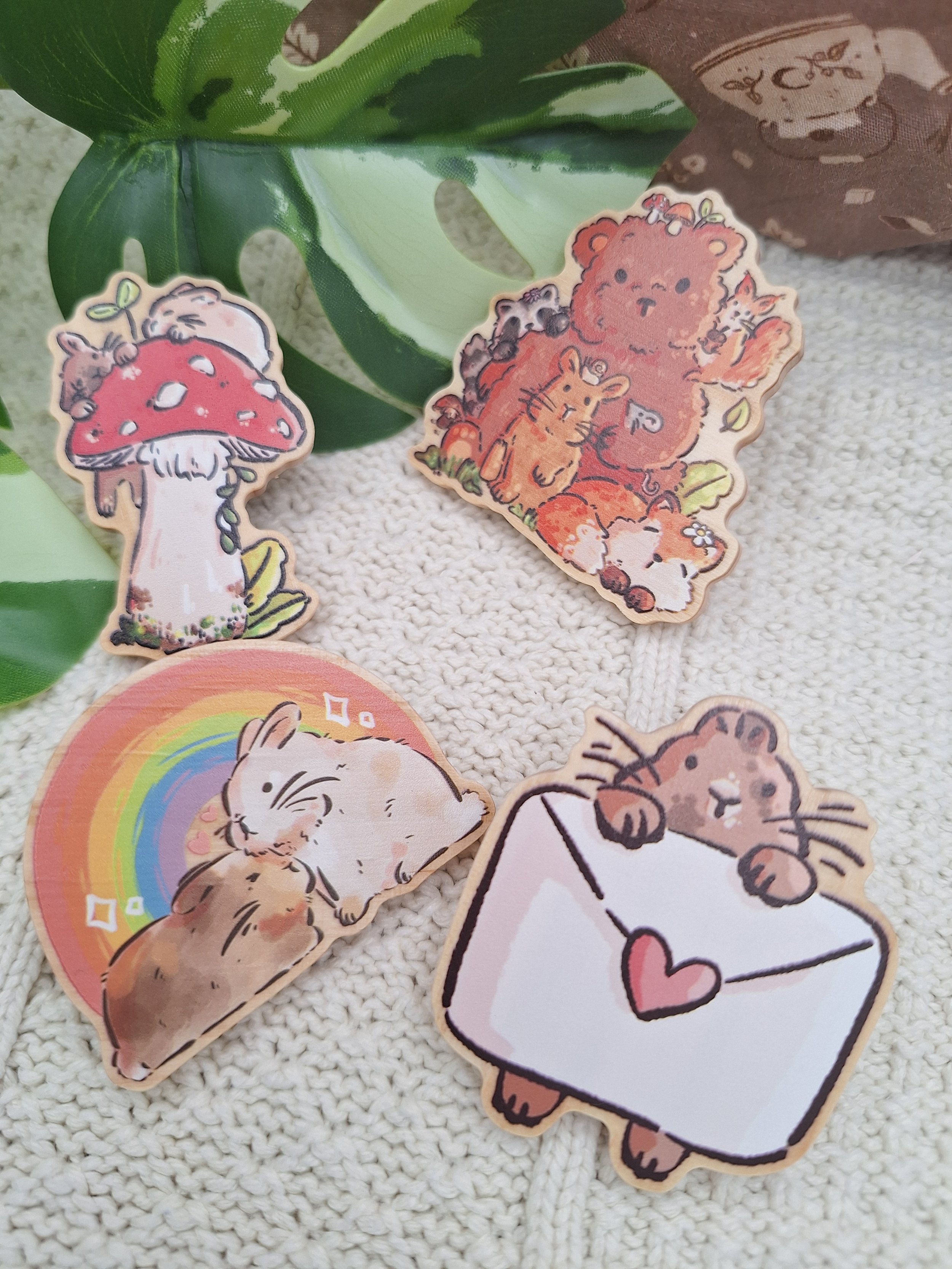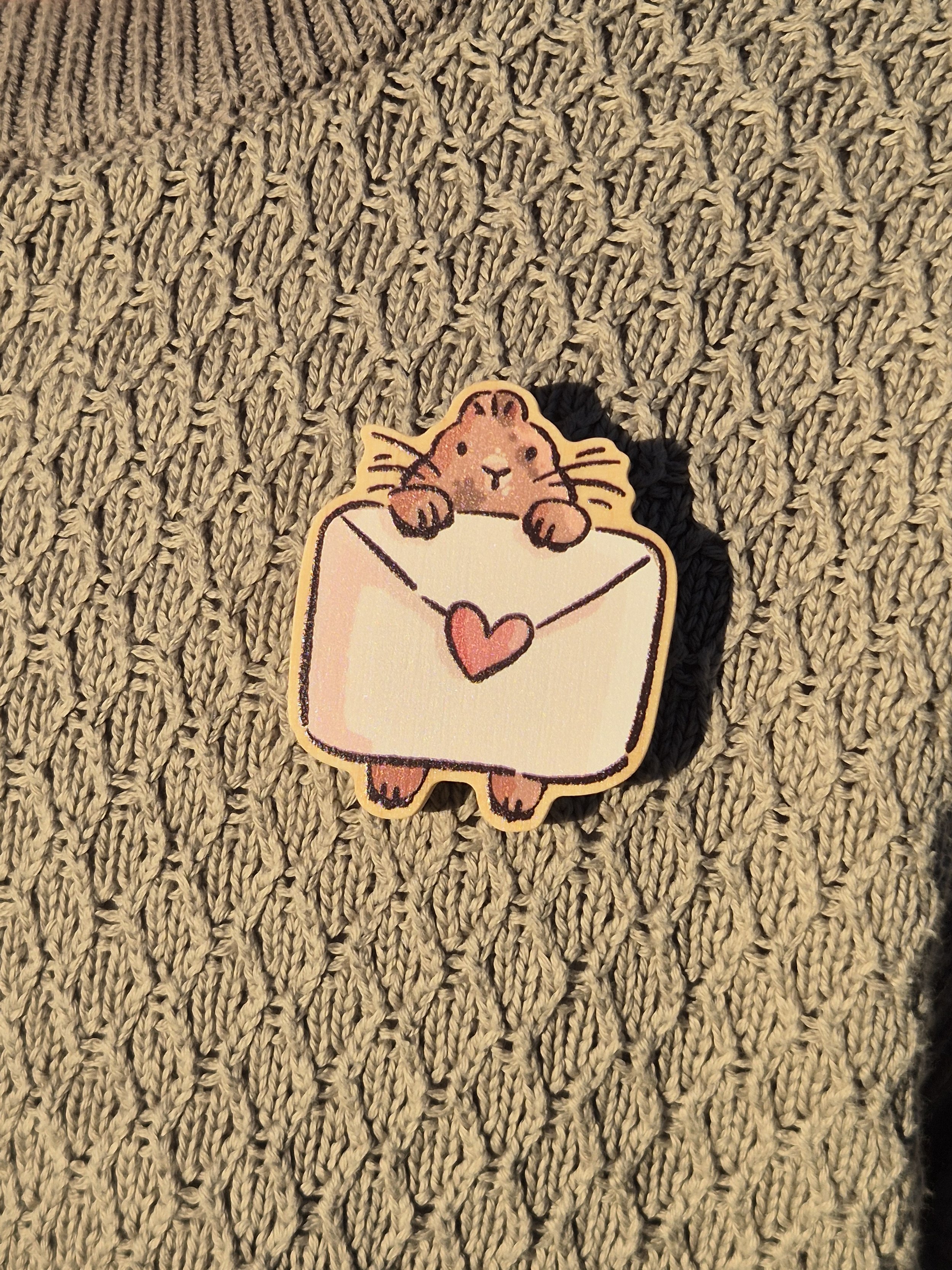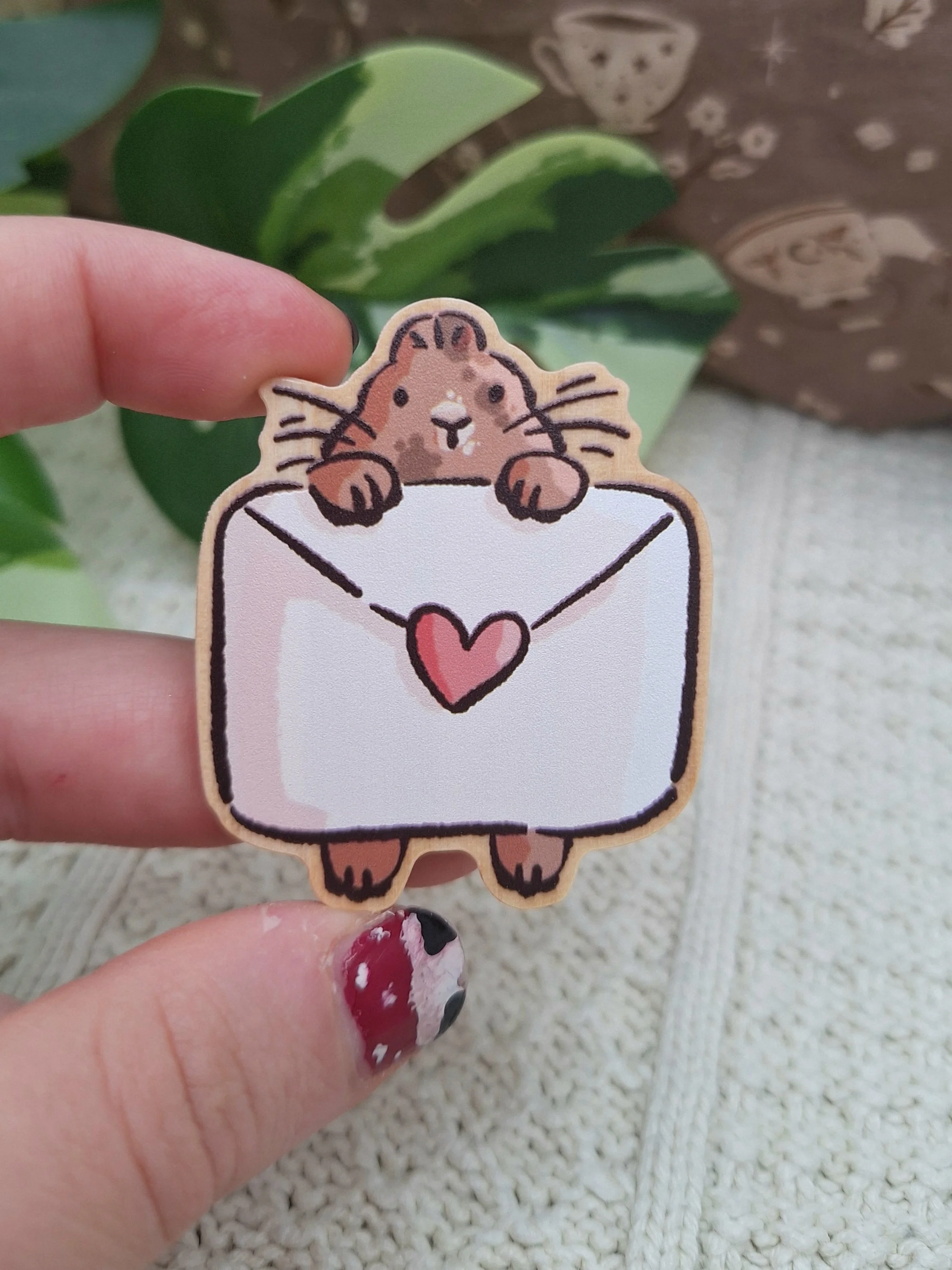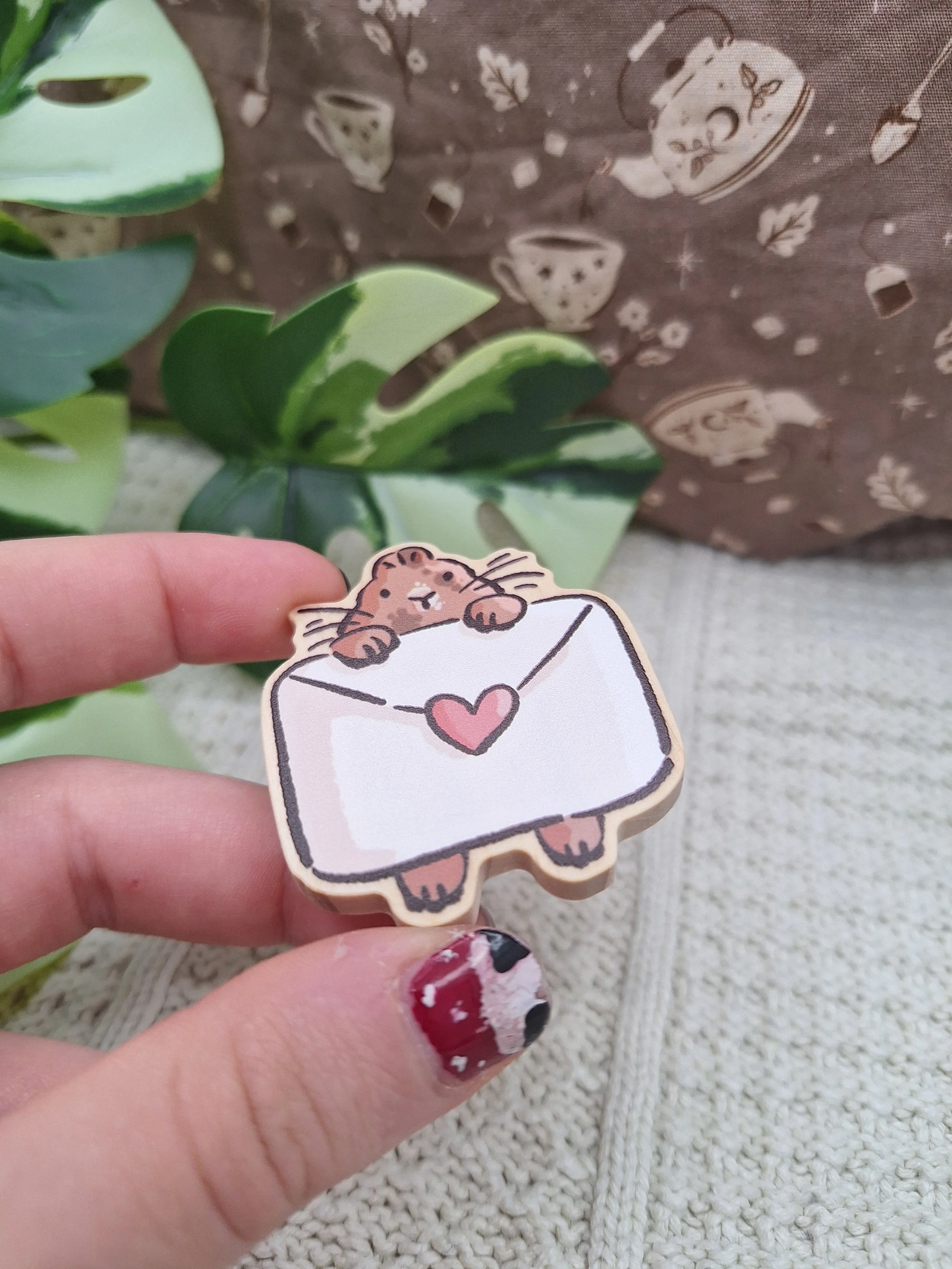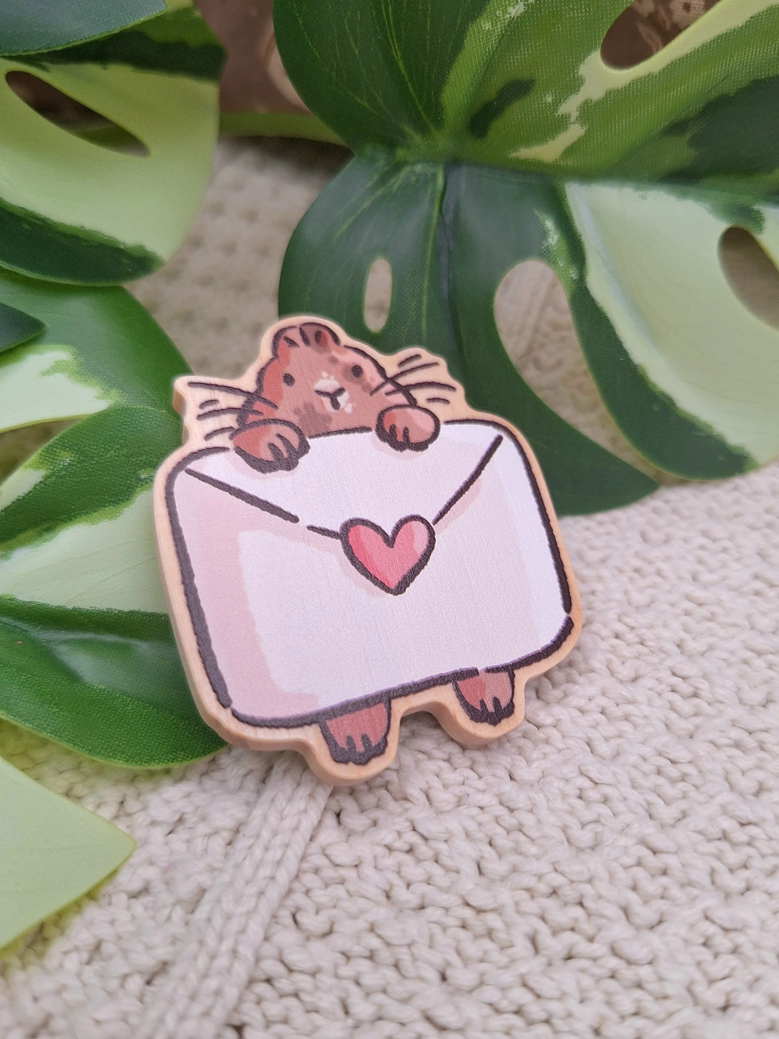 This wooden pin features a cute bunny behind a love letter. The wooden look and feel of the pin creates a very cozy vibe.