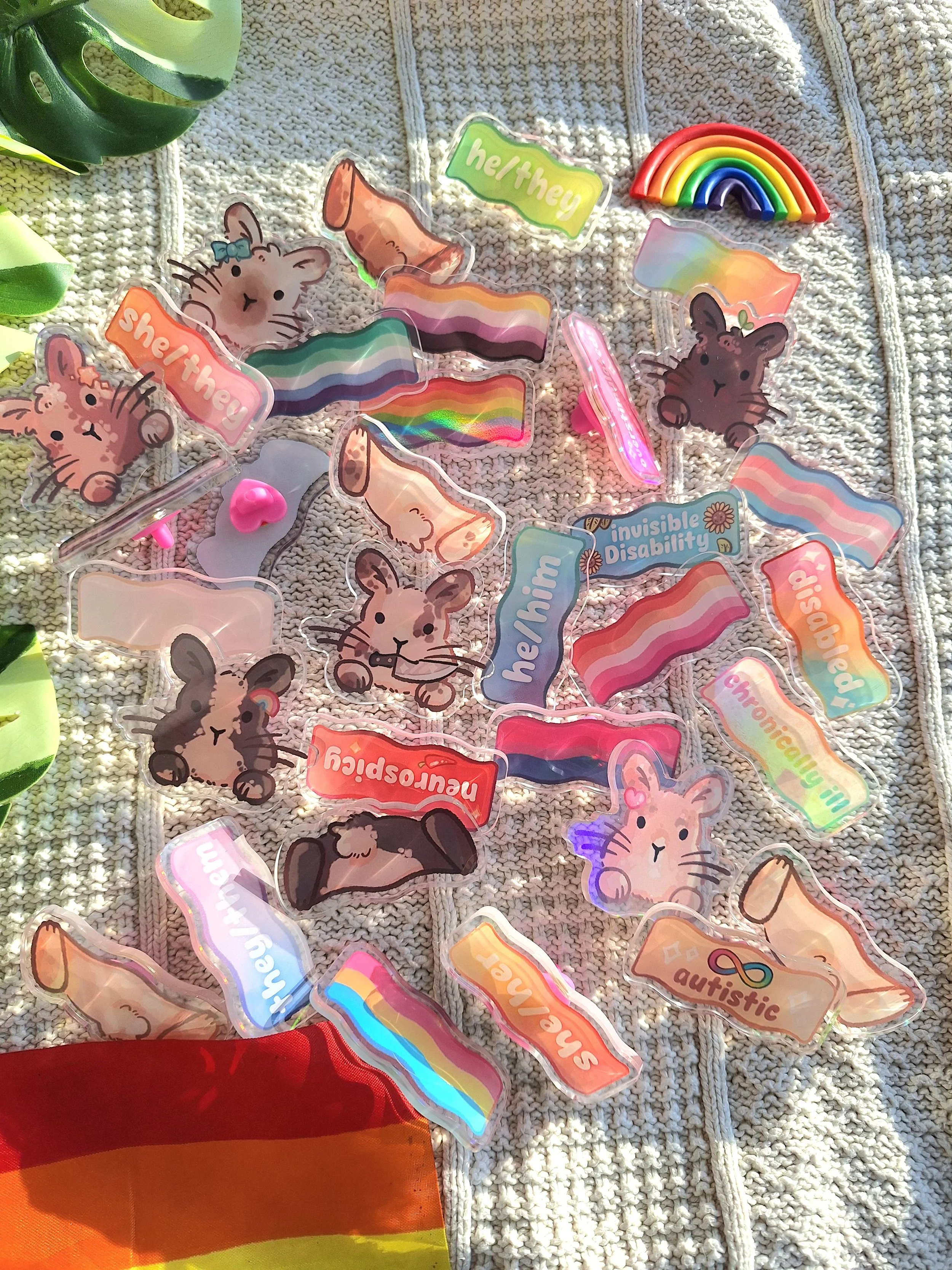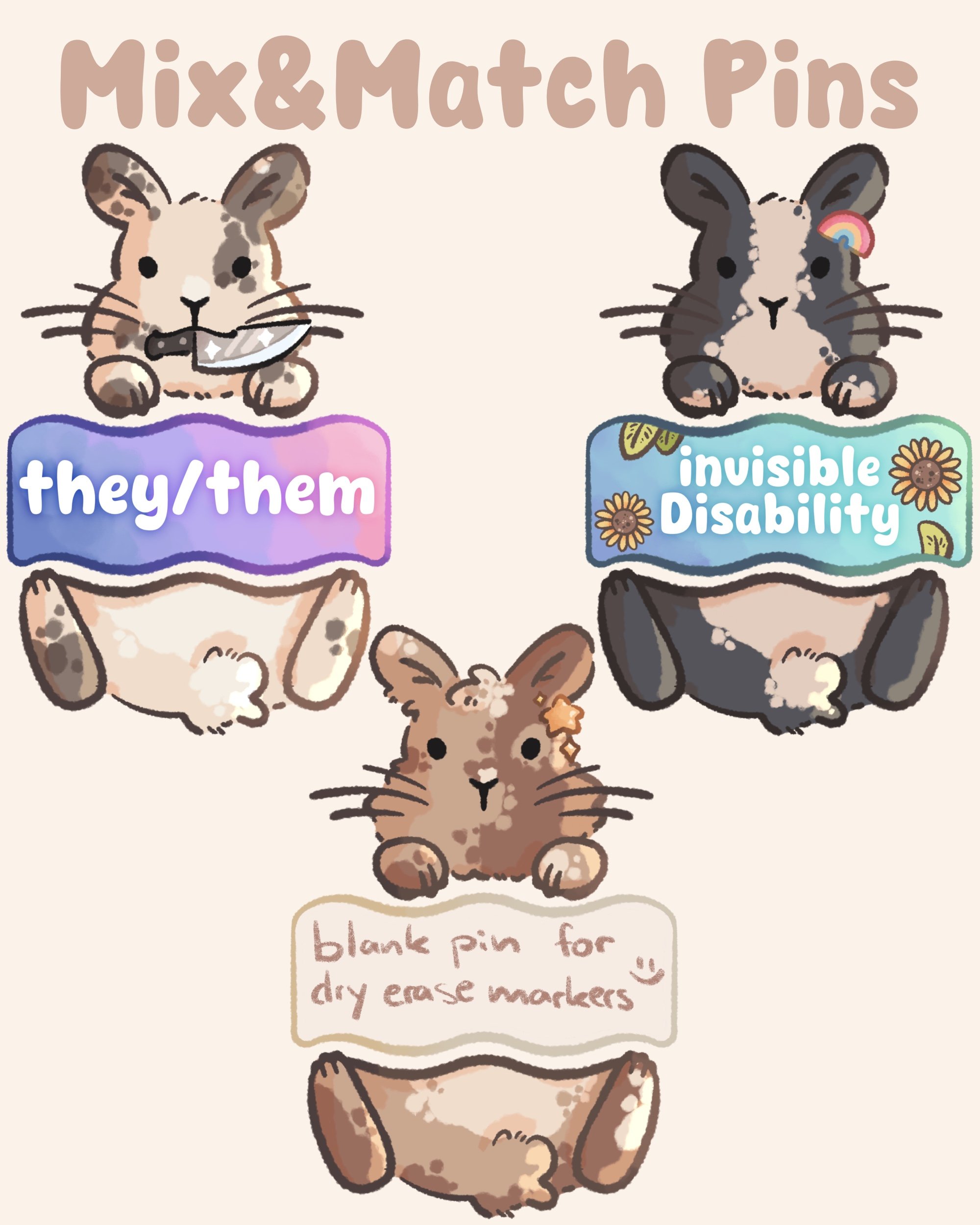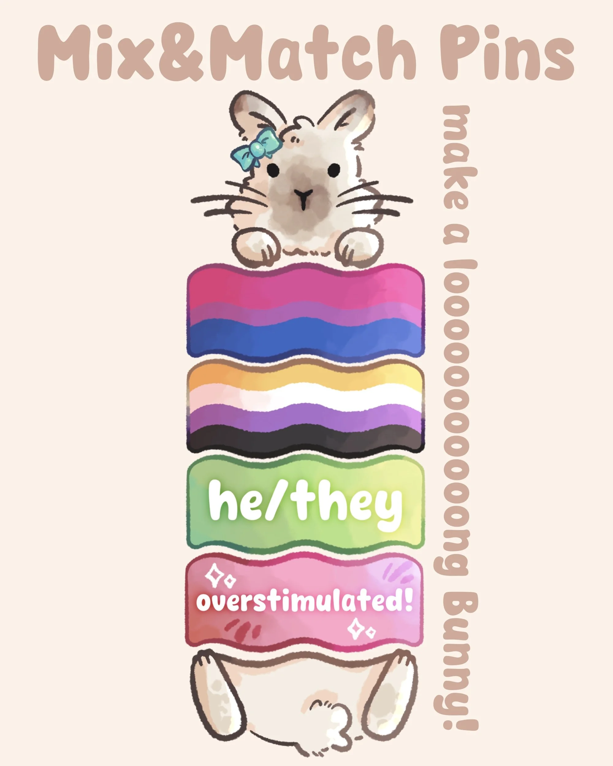Choose between 6 different bunny designs and lots of different middle pieces including pronouns, many queer pride flags and other labels.