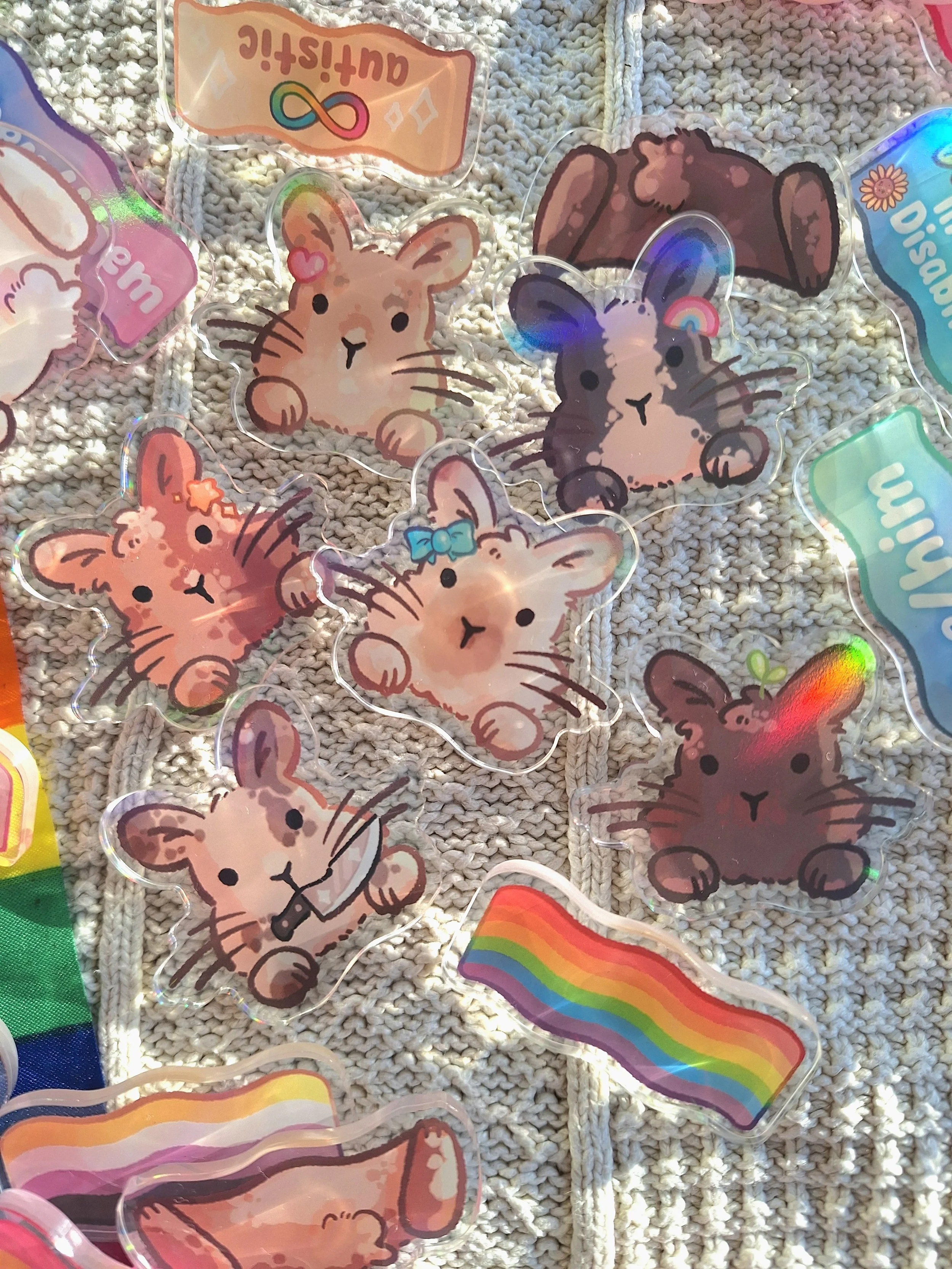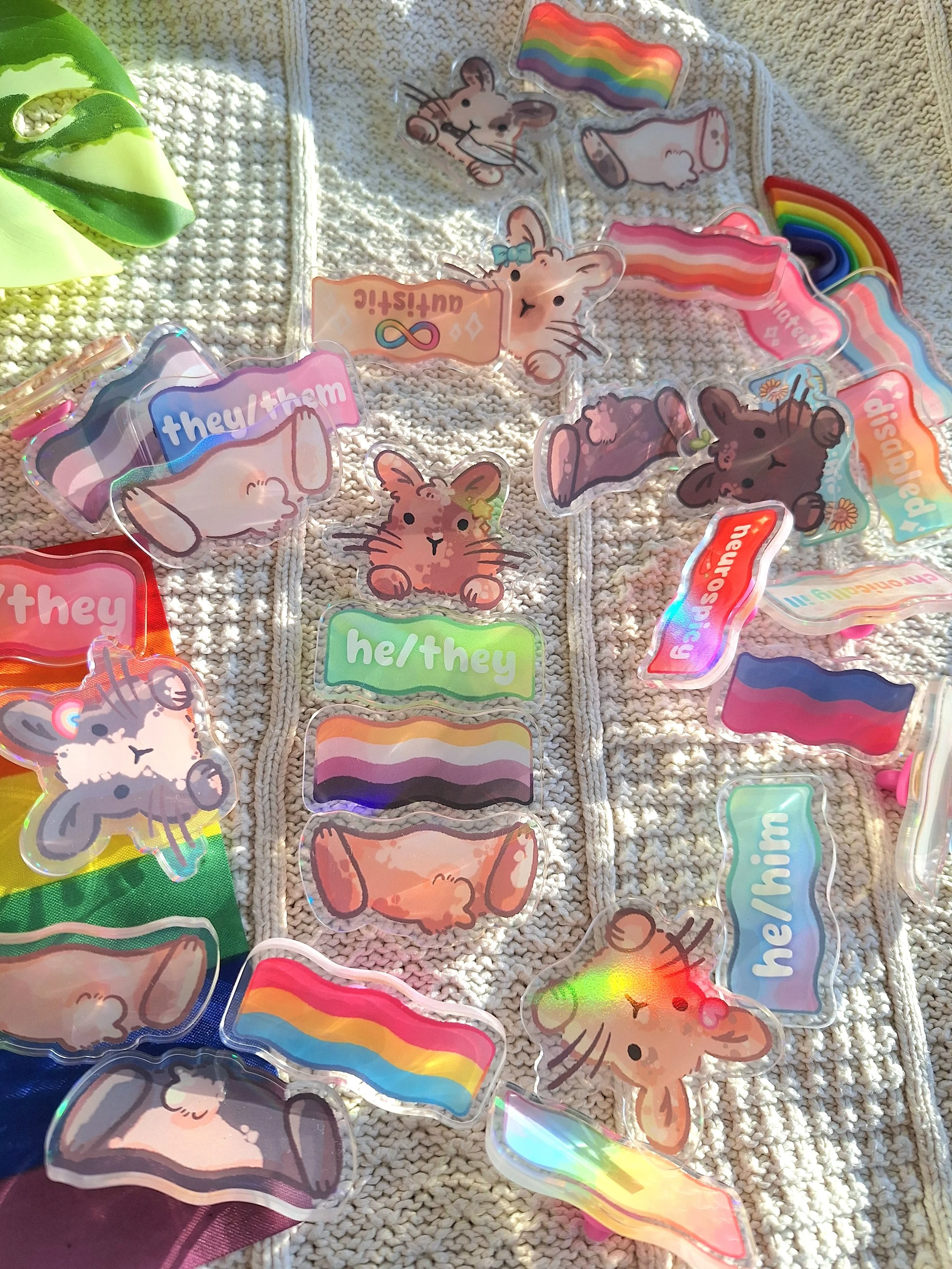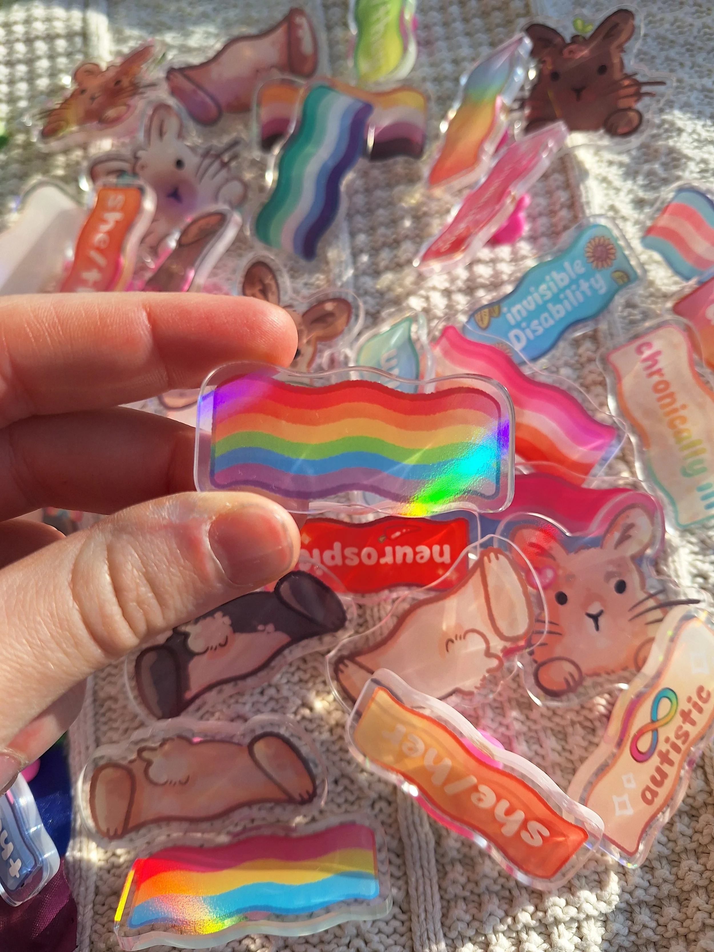 Choose between 6 different bunny designs and lots of different middle pieces including pronouns, many queer pride flags and other labels.