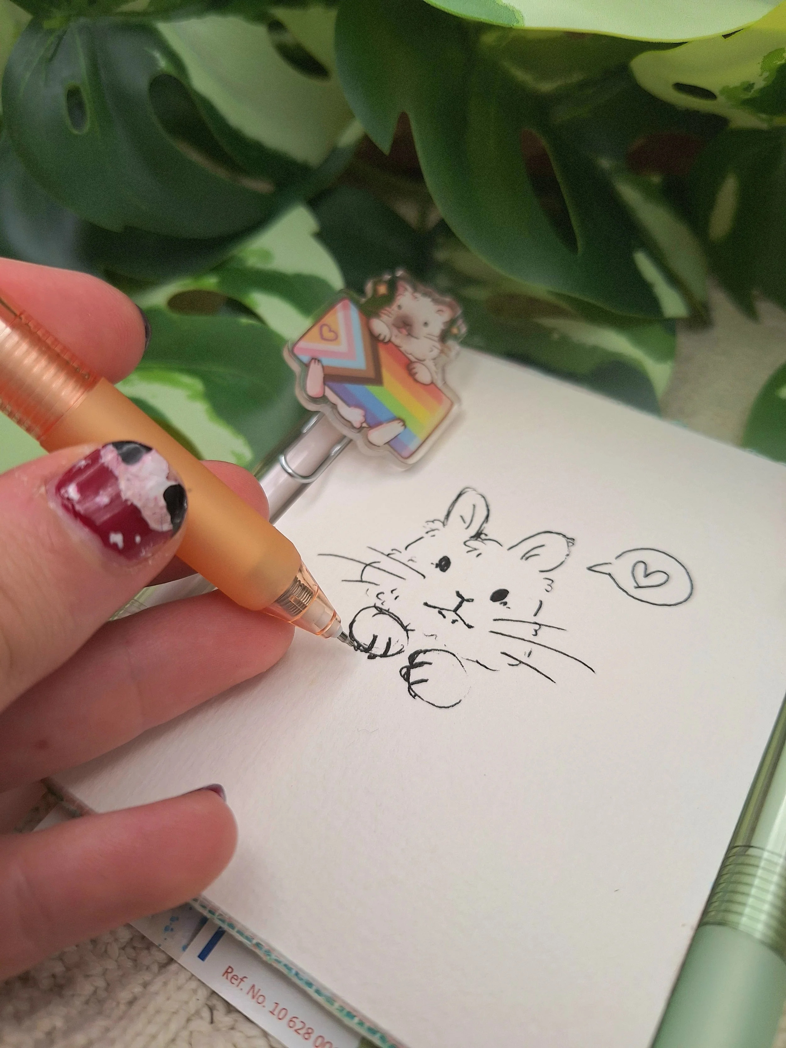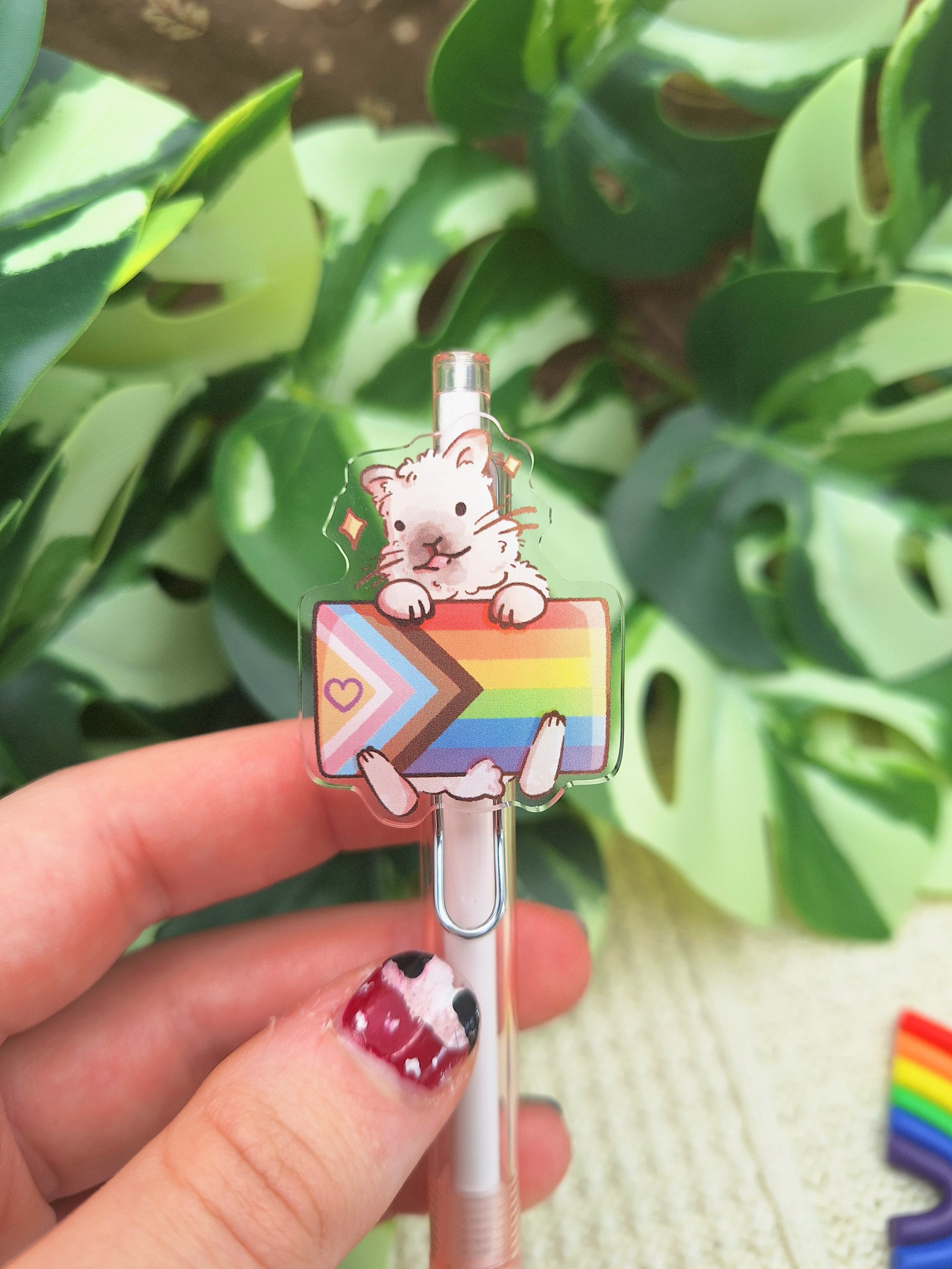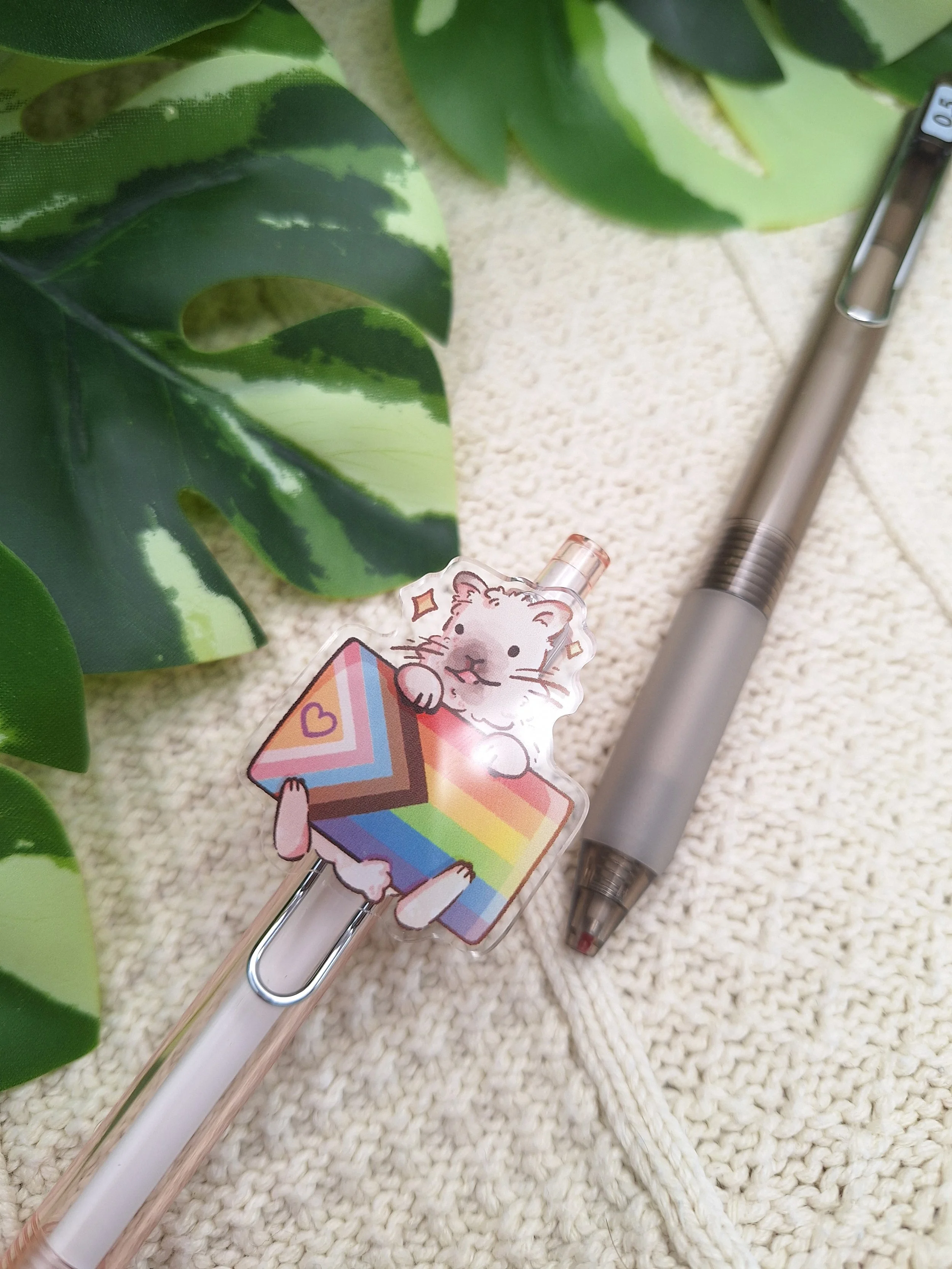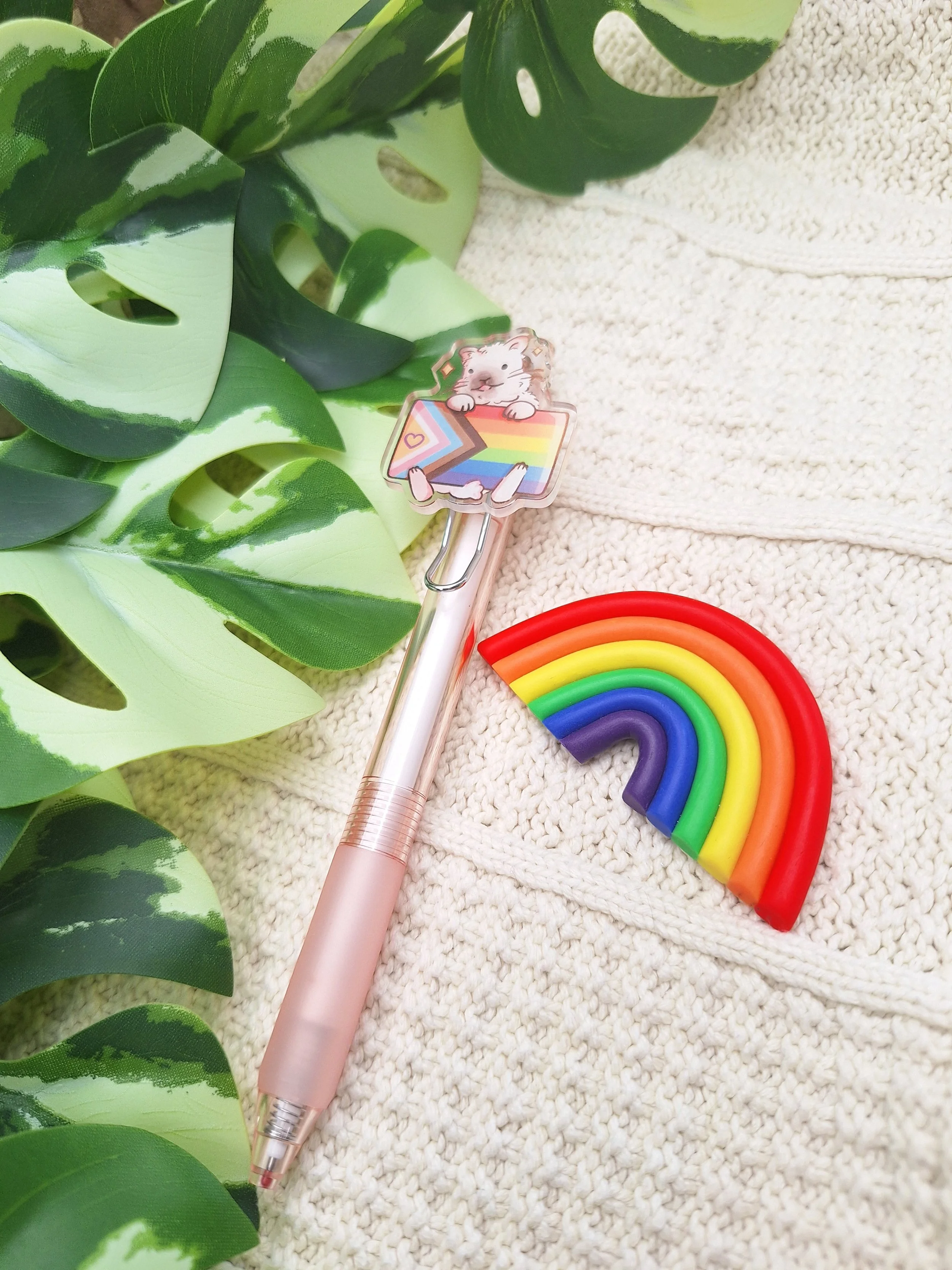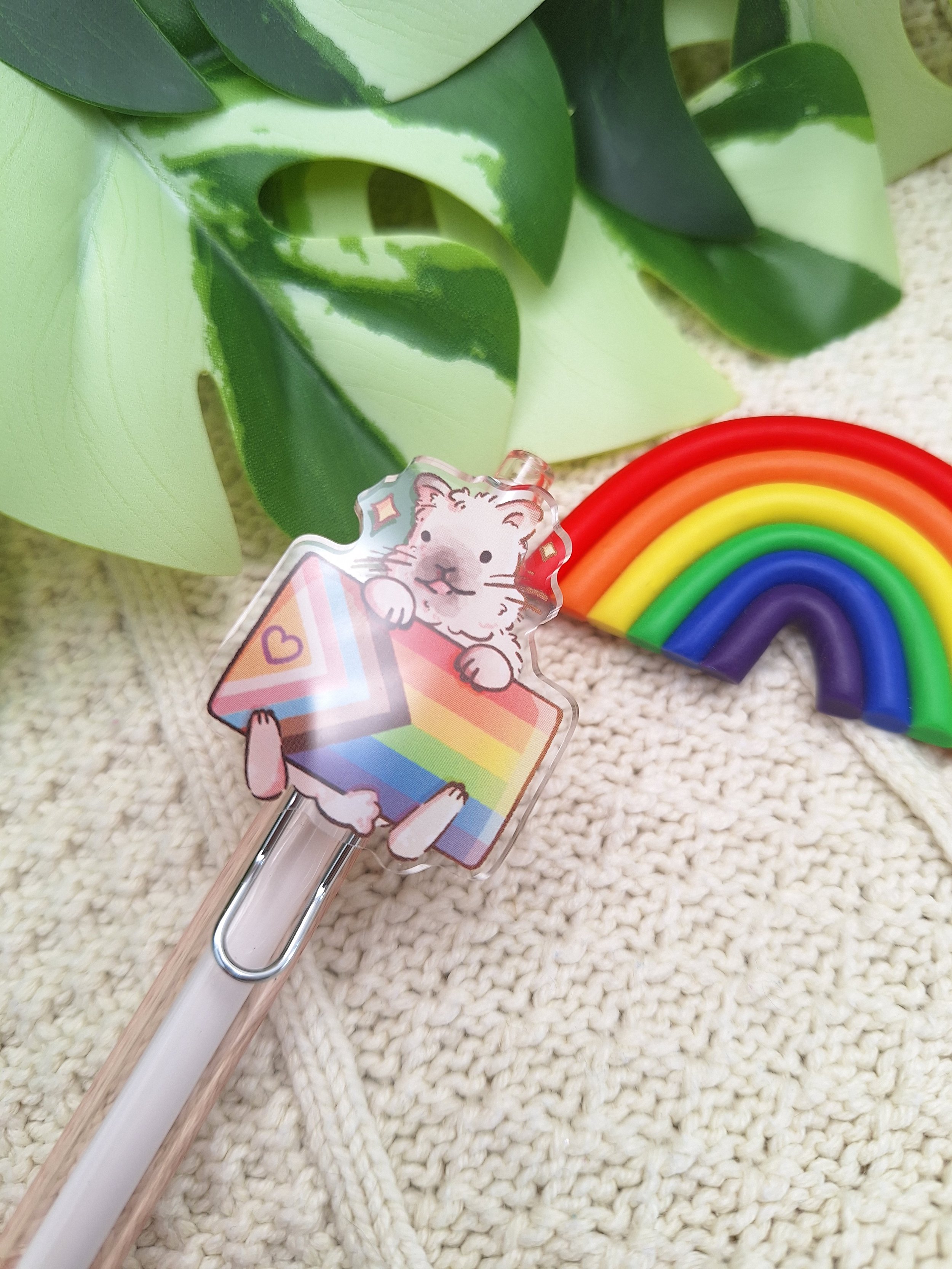 This adorable keychain consists of three connected small acrylic charms, from top to bottom: two cute cuddling buns, the progress pride flag and another pair of cuddling buns.