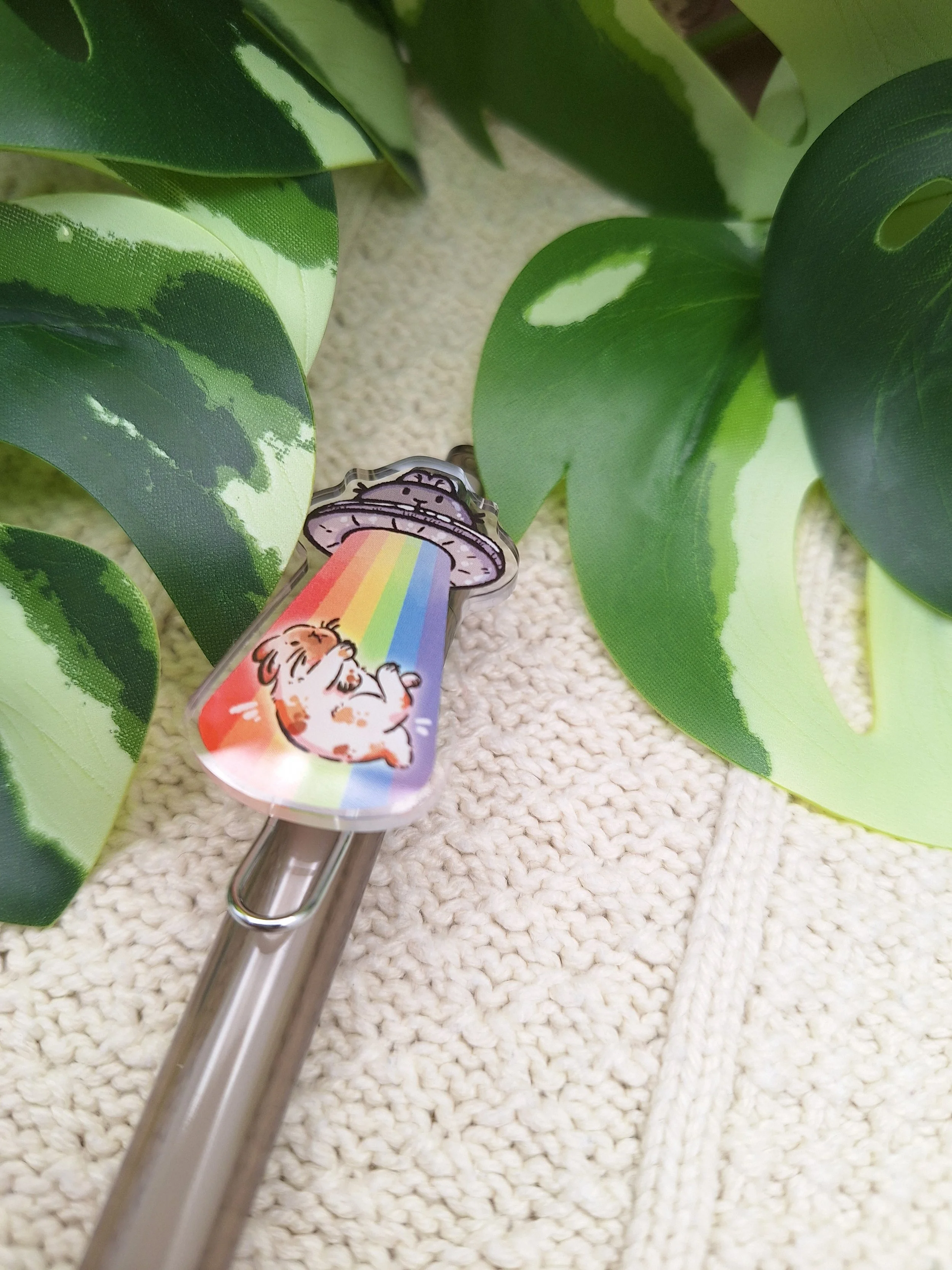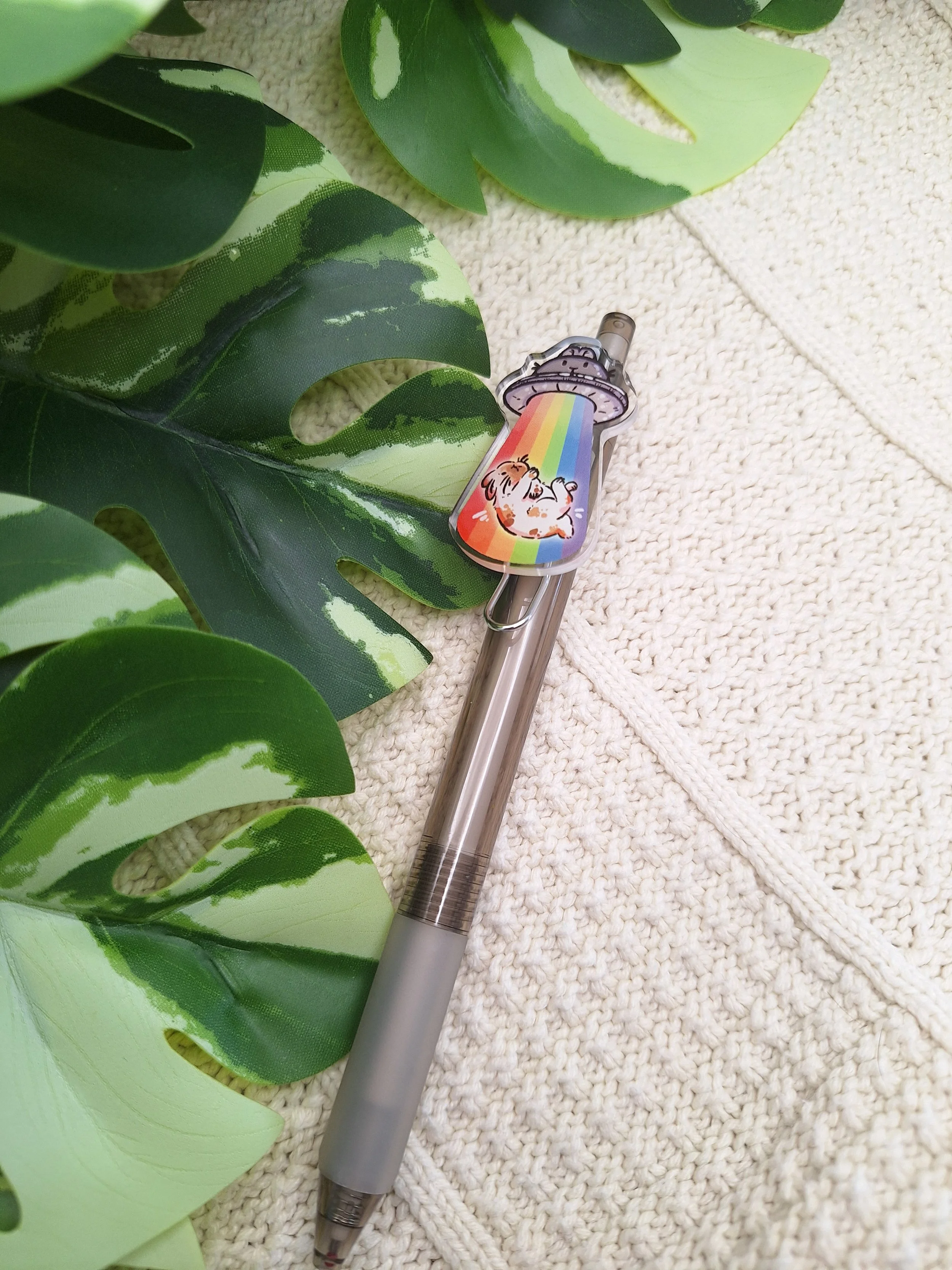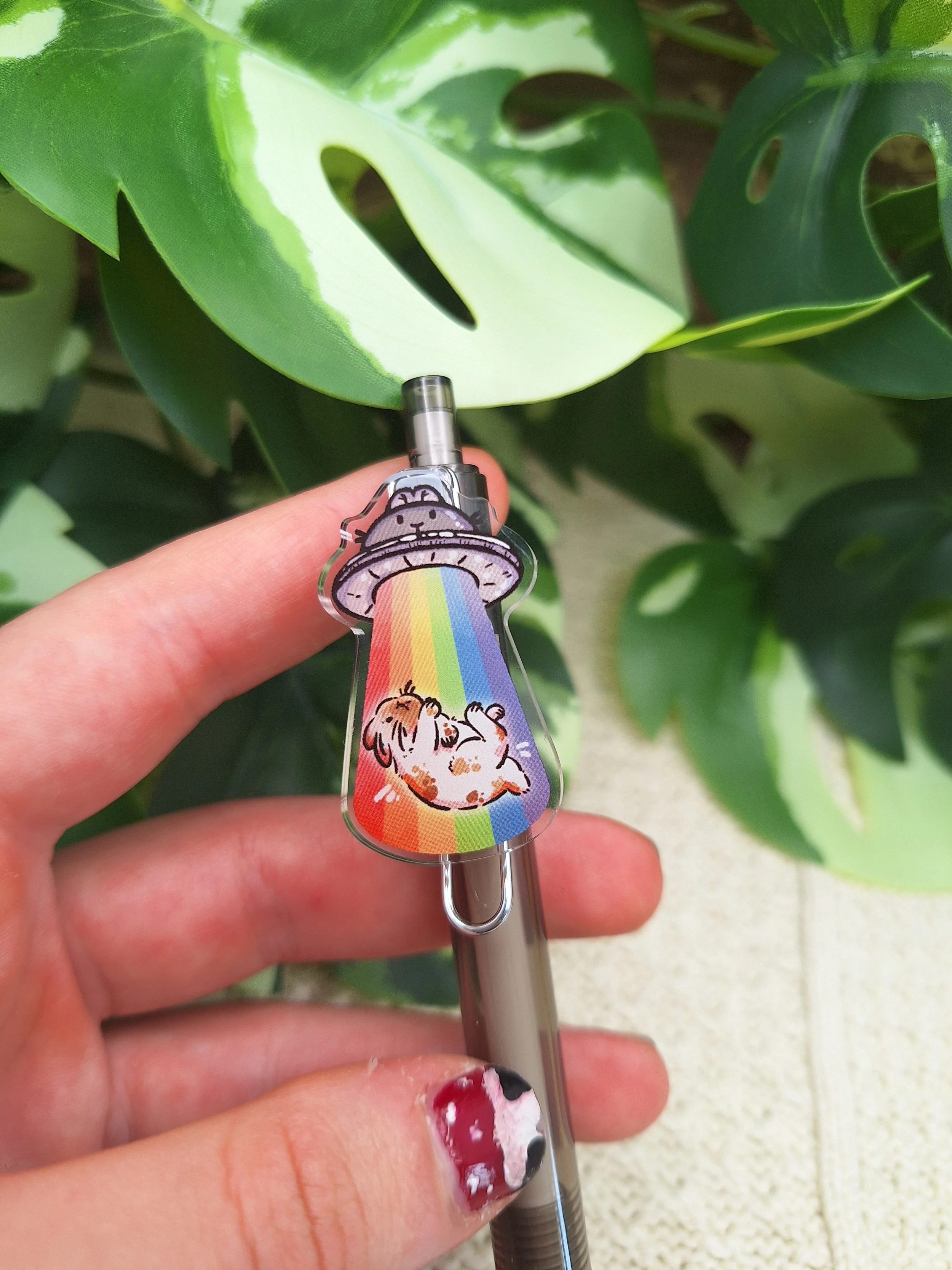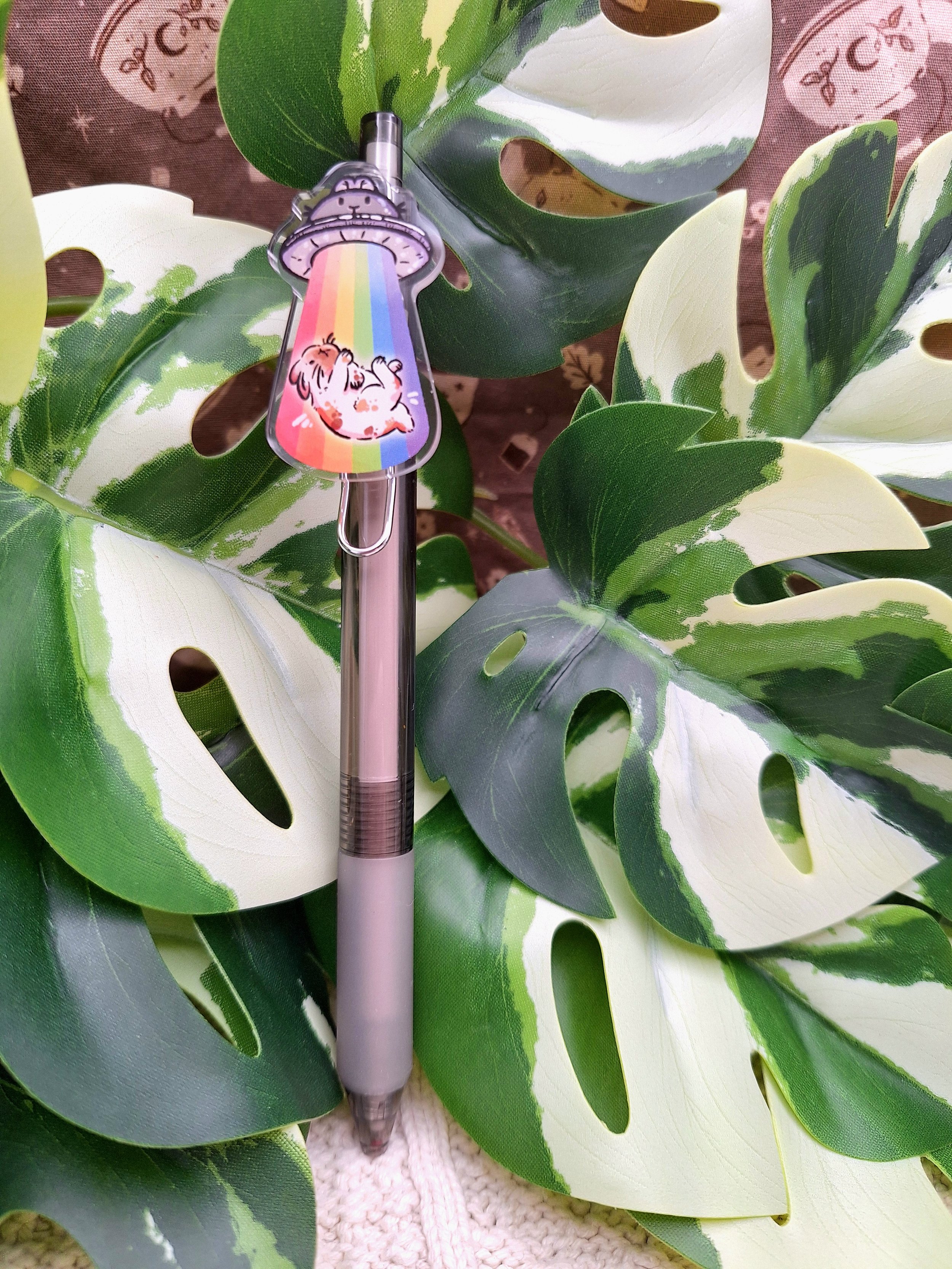 Never write with boring pens again! This adorable black ballpoint pen features an acrylic charm of bun being drawn up by a rainbow UFO.