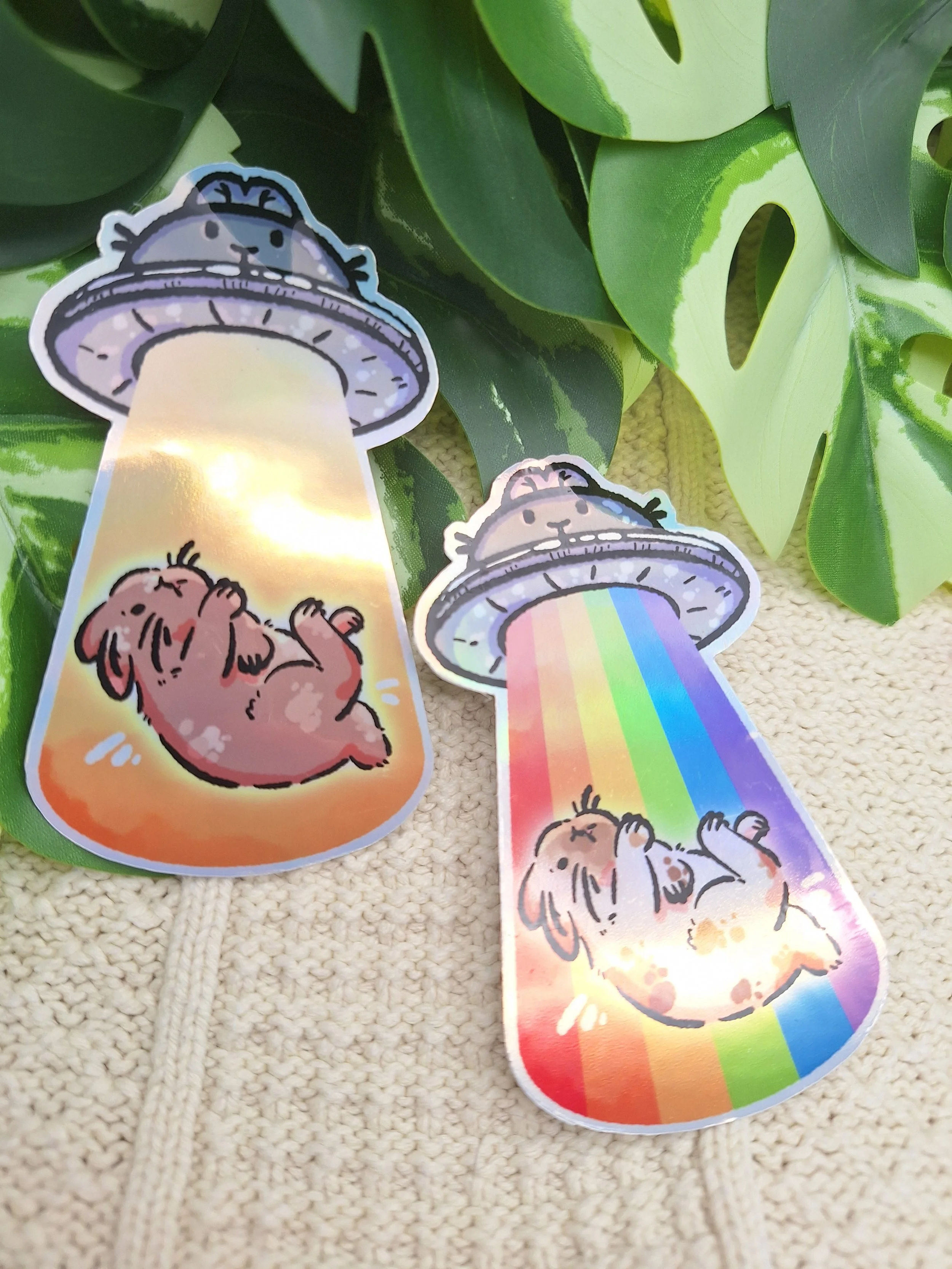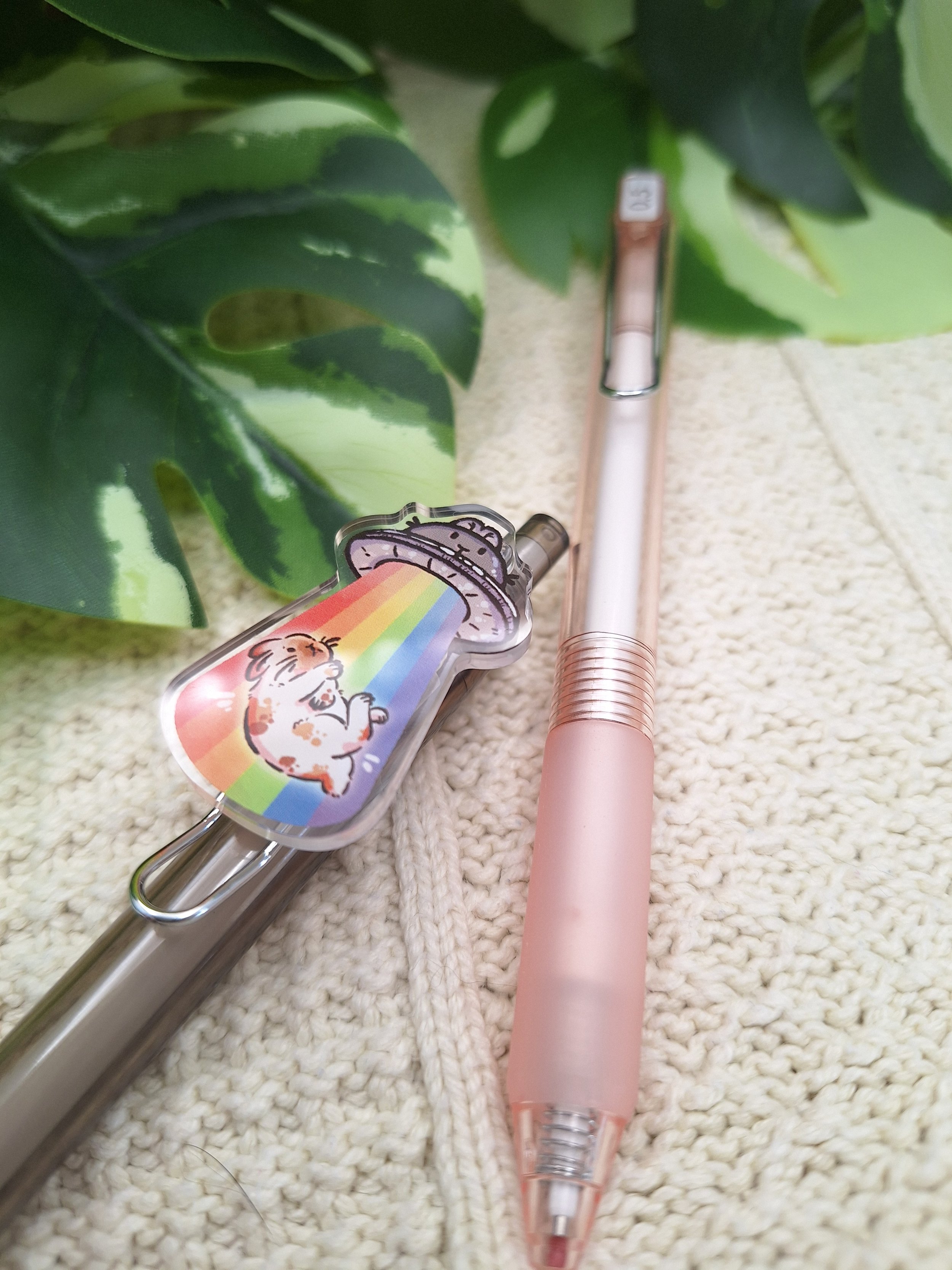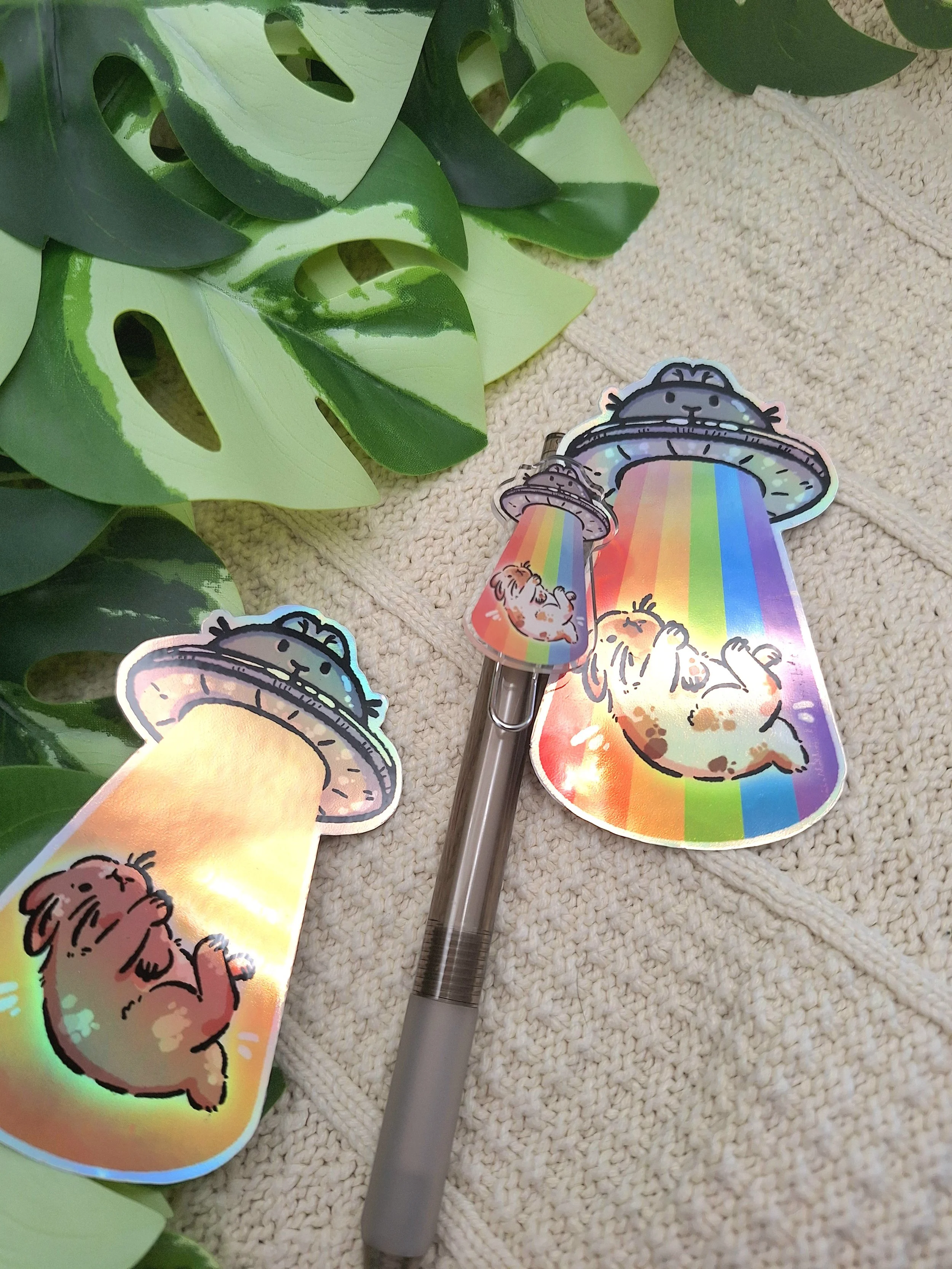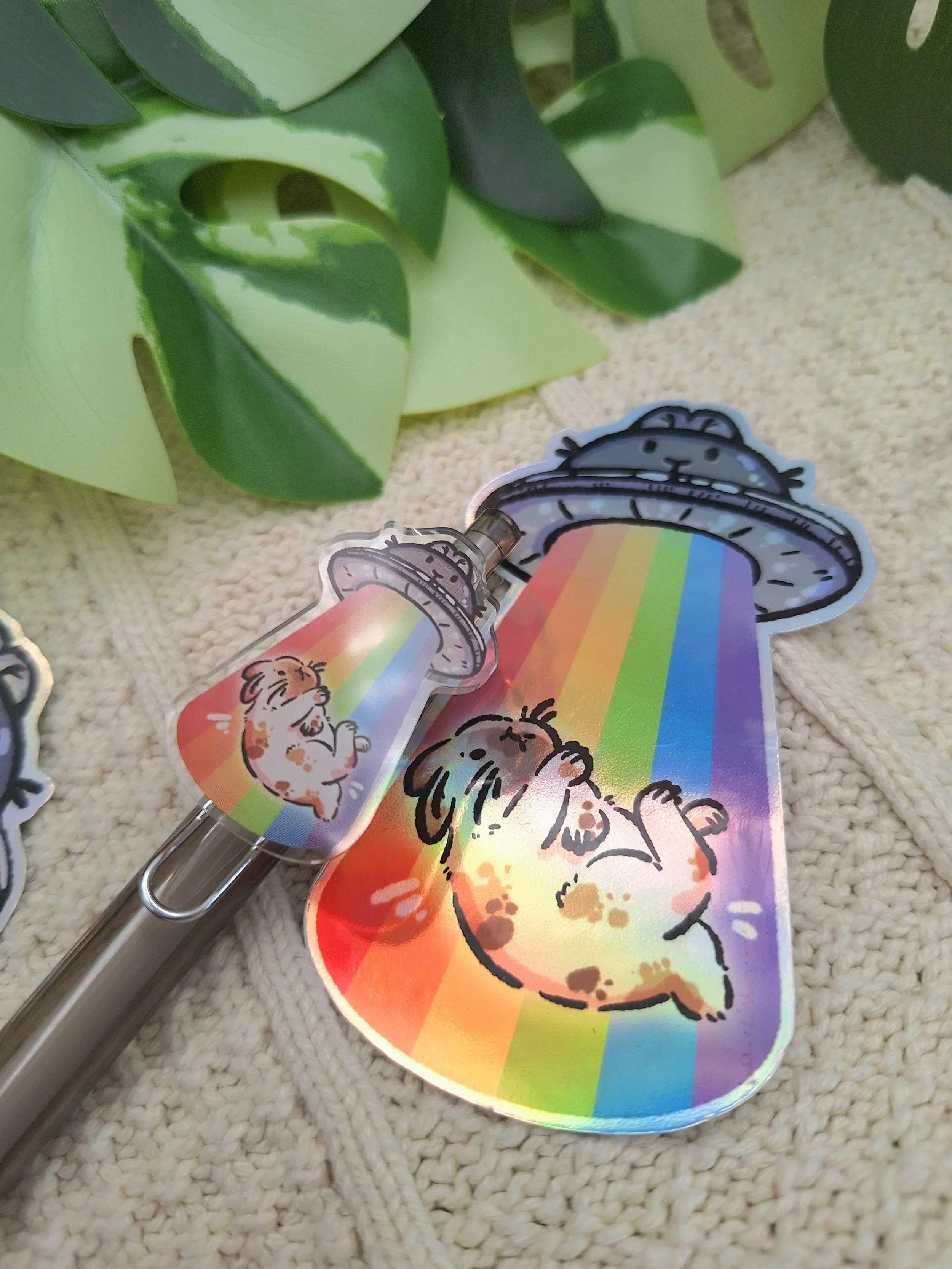 Never write with boring pens again! This adorable black ballpoint pen features an acrylic charm of bun being drawn up by a rainbow UFO.