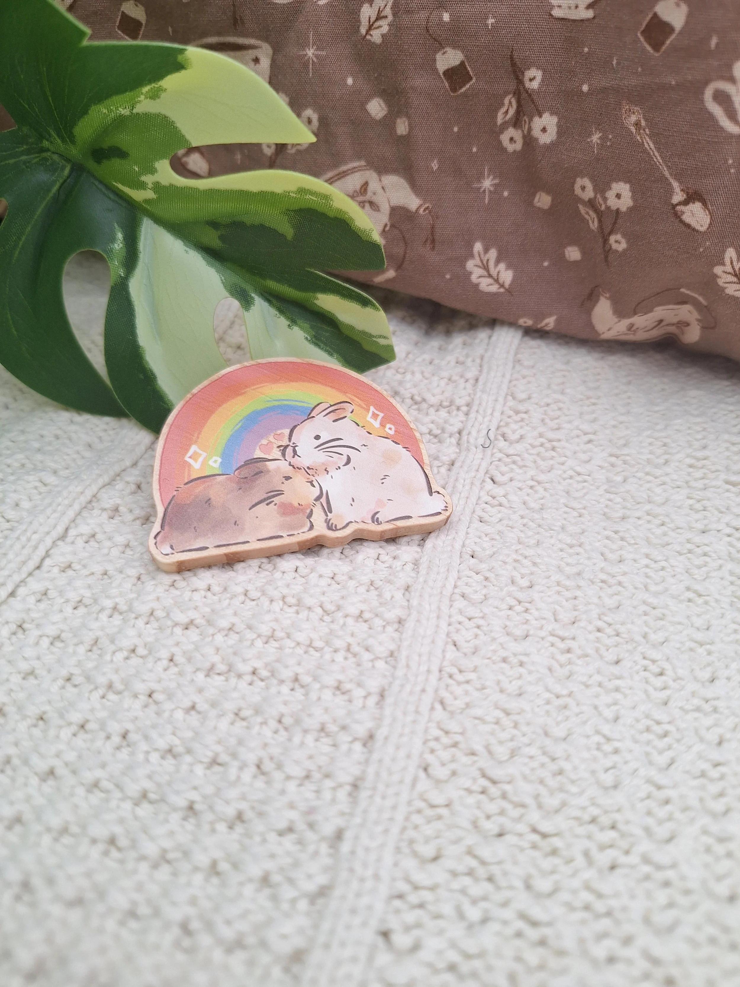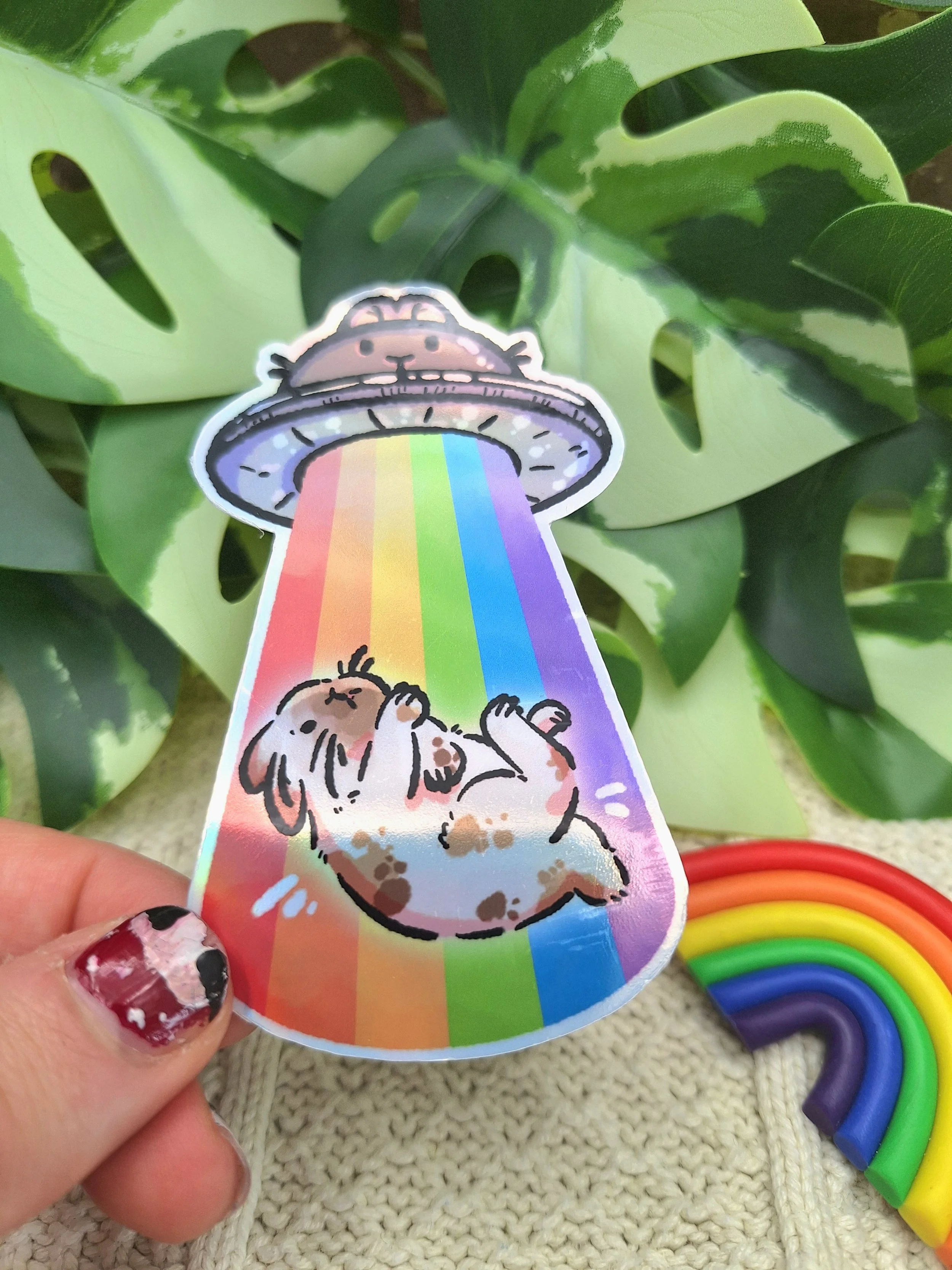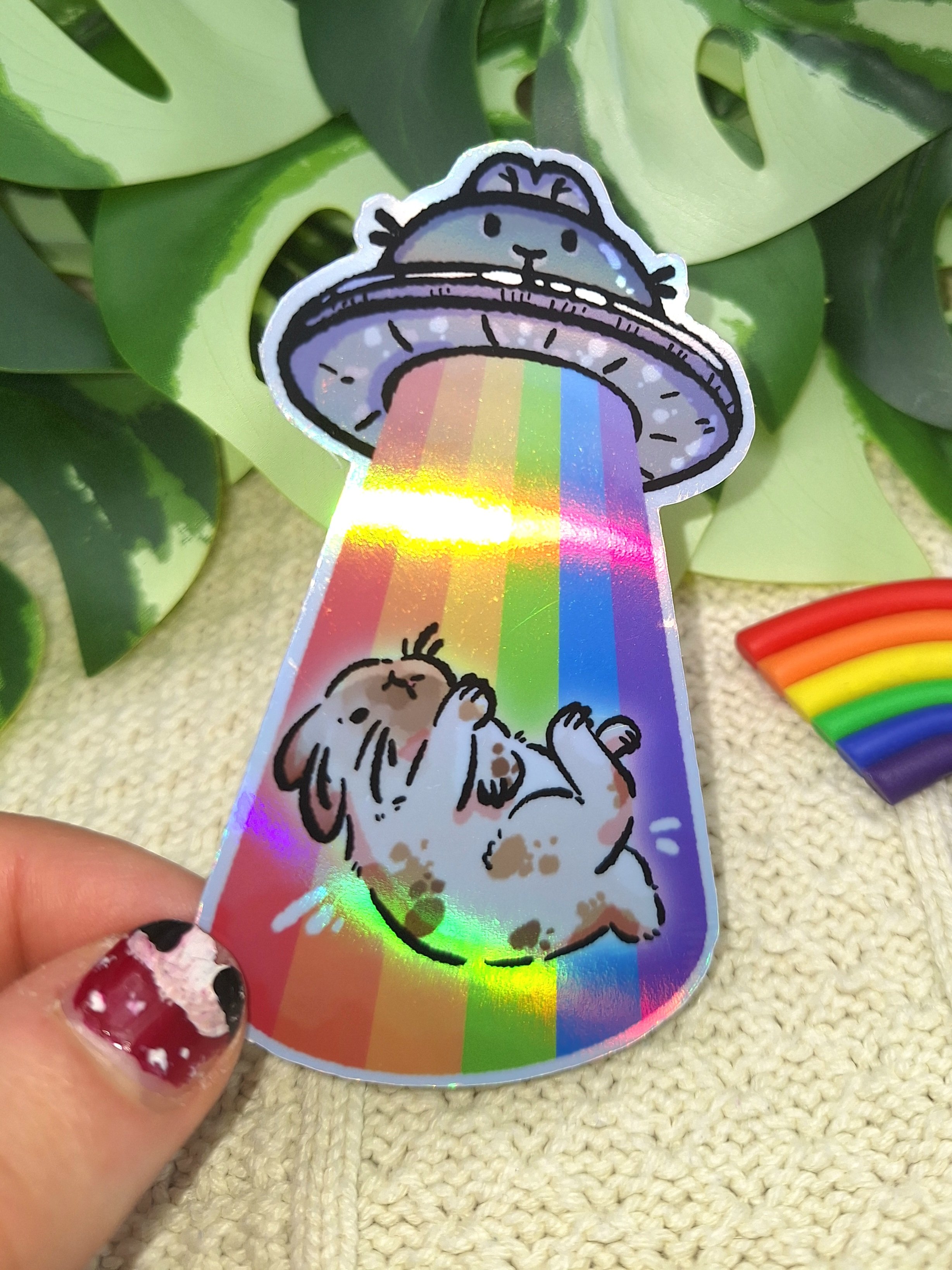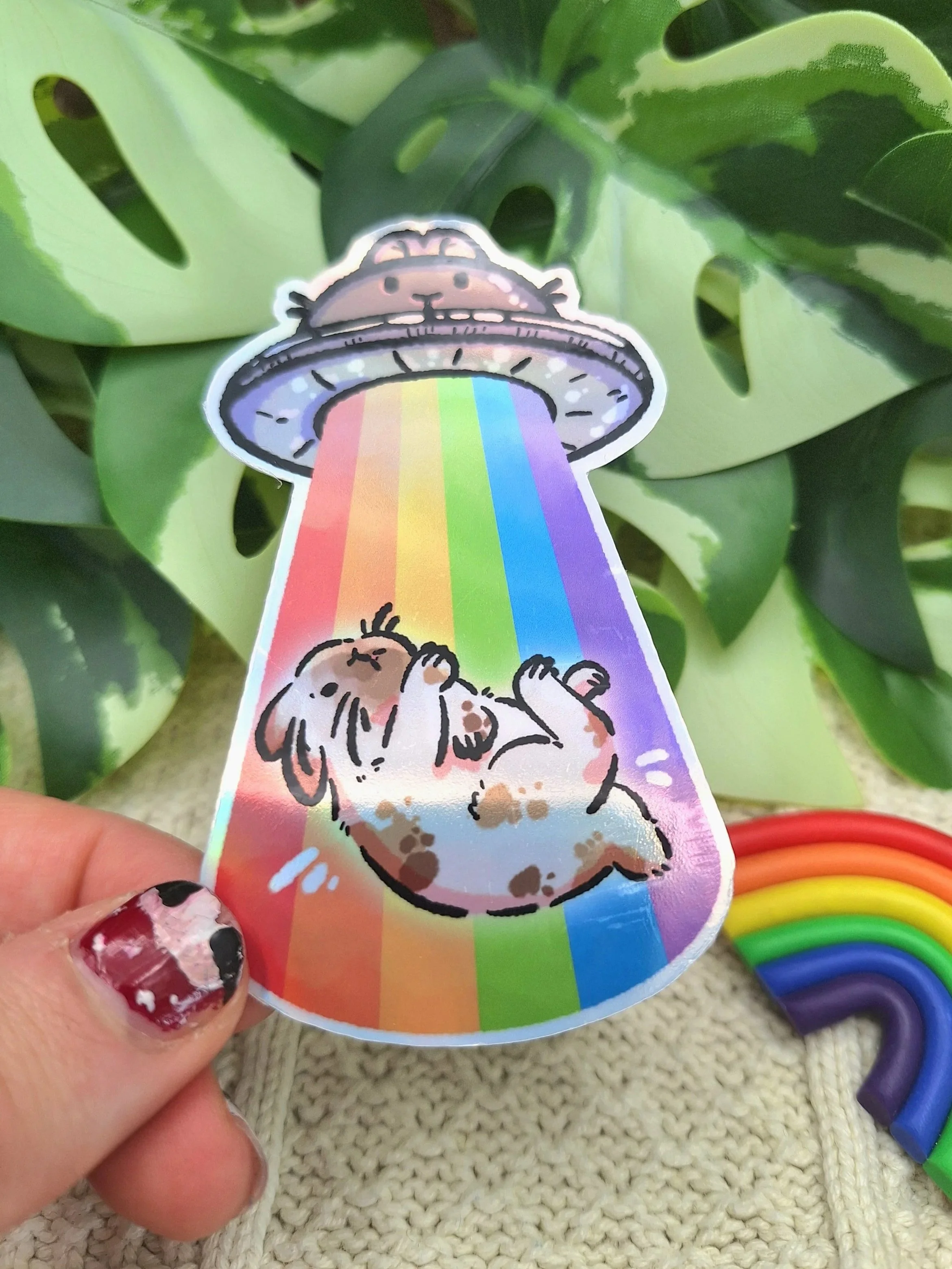 Never write with boring pens again! This adorable black ballpoint pen features an acrylic charm of bun being drawn up by a rainbow UFO.